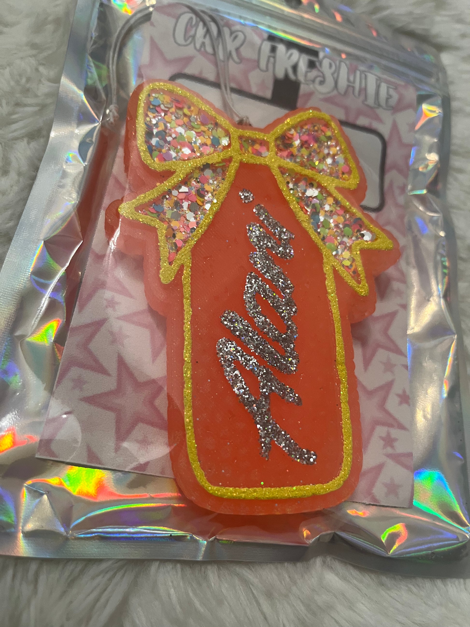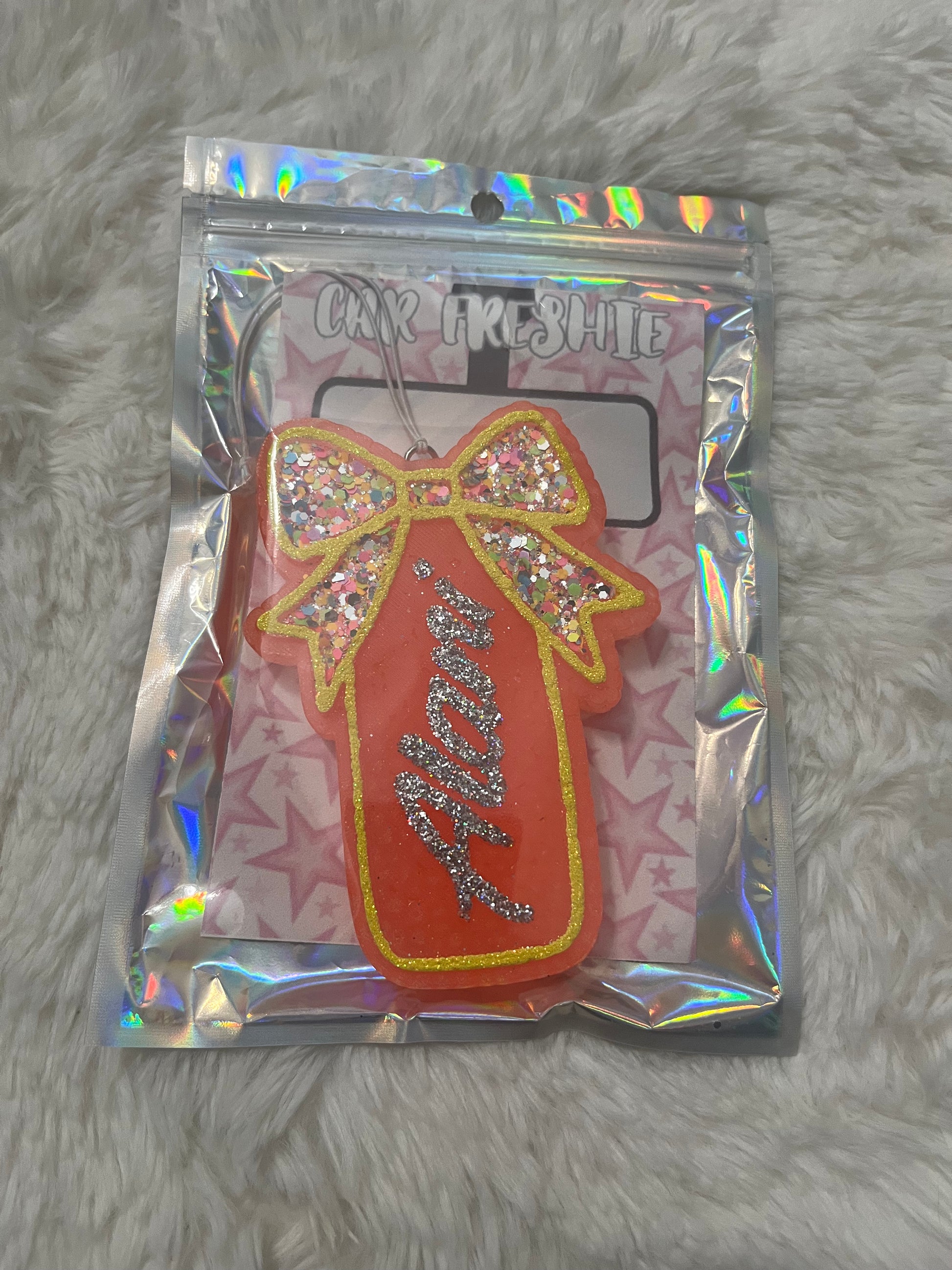 Bright, bold, and bursting with charm—this glittery bow freshie is ready to steal the spotlight! With a dazzling mix of chunky rainbow glitter, a golden trim, and the word “Alani” sparkling down the center, it’s a perfect mix of sweet and glam.