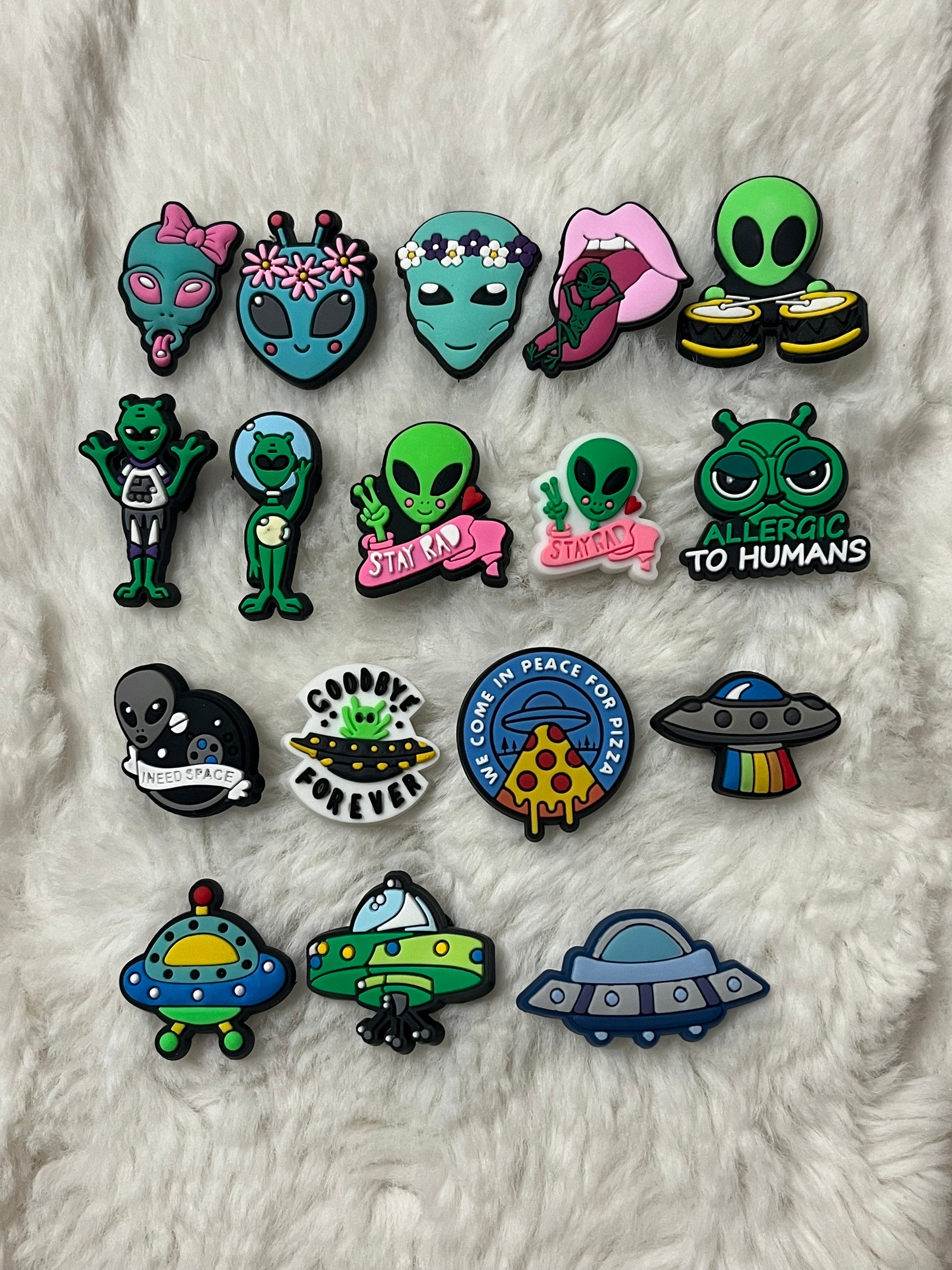 Ready to beam up your Crocs game? This alien & UFO-inspired charm collection is packed with cosmic personality — whether you’re a believer, a skeptic, or just love quirky accessories, these little extraterrestrials are here to make your shoes stellar.