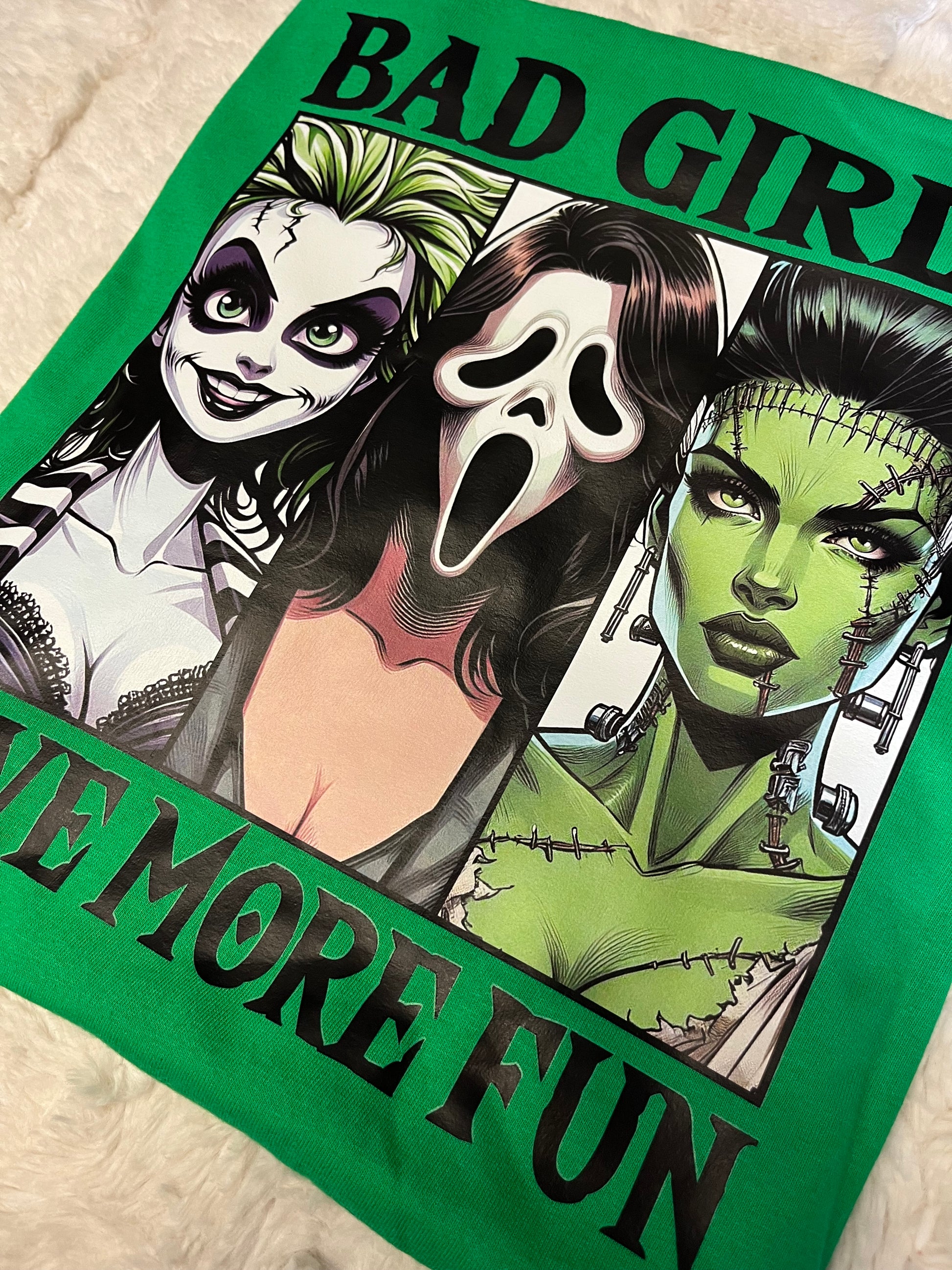 - The front graphic features three legendary “bad girls” inspired by classic horror favorites. The first gives major Beetlejuice energy with her wild black-and-white stripes, sharp grin, and playful mischief in her eyes. In the middle, a mysterious figure with the iconic Ghostface mask brings that slasher-style suspense to the lineup. And on the right, a gorgeous reimagining of Frankenstein’s Bride glows in shades of green, stitched together with power and poise. The phrase BAD GIRLS HAVE MORE FUN crowns and grounds the trio in bold gothic lettering, completing the ultimate ode to villainous glamour.