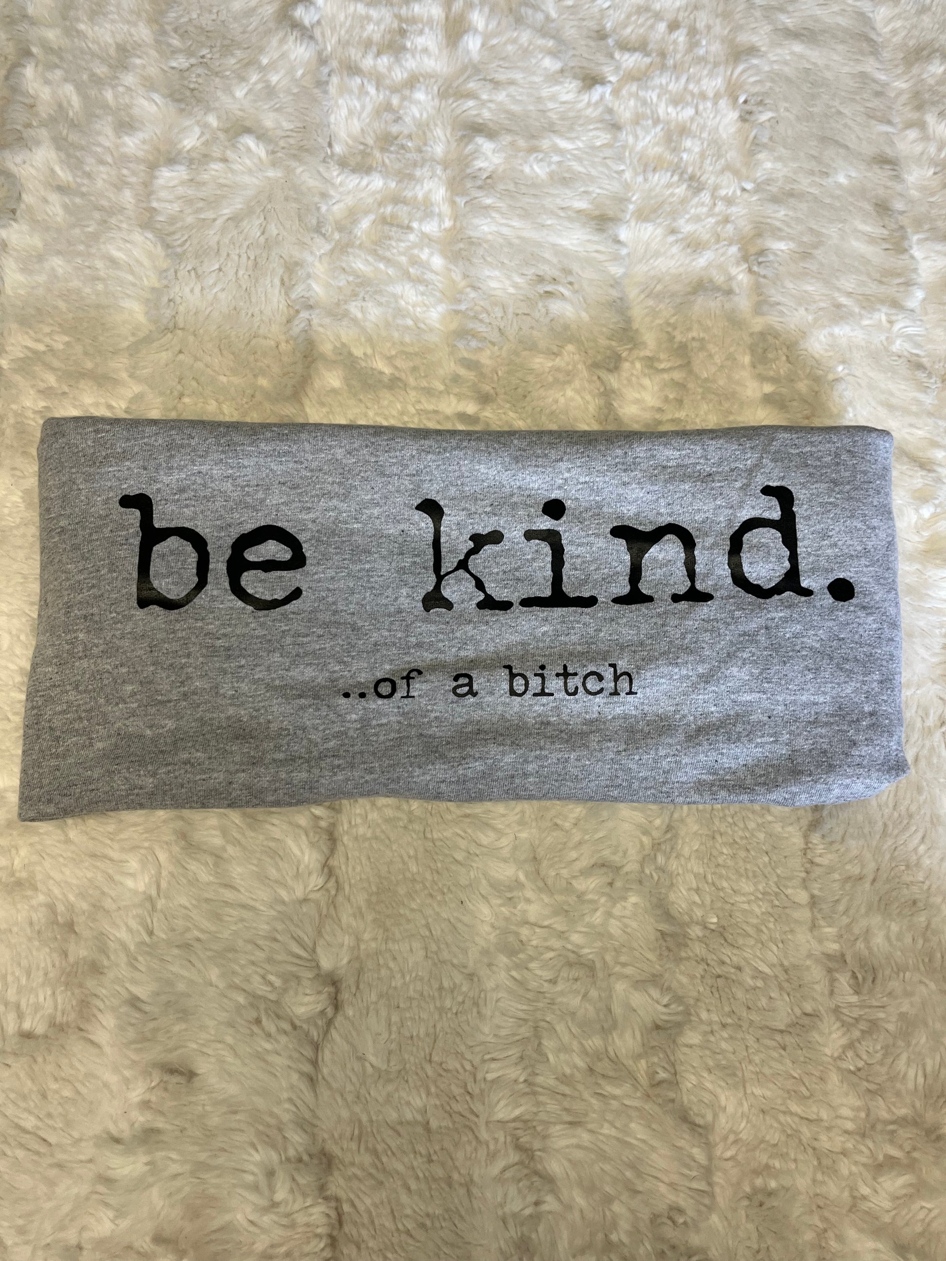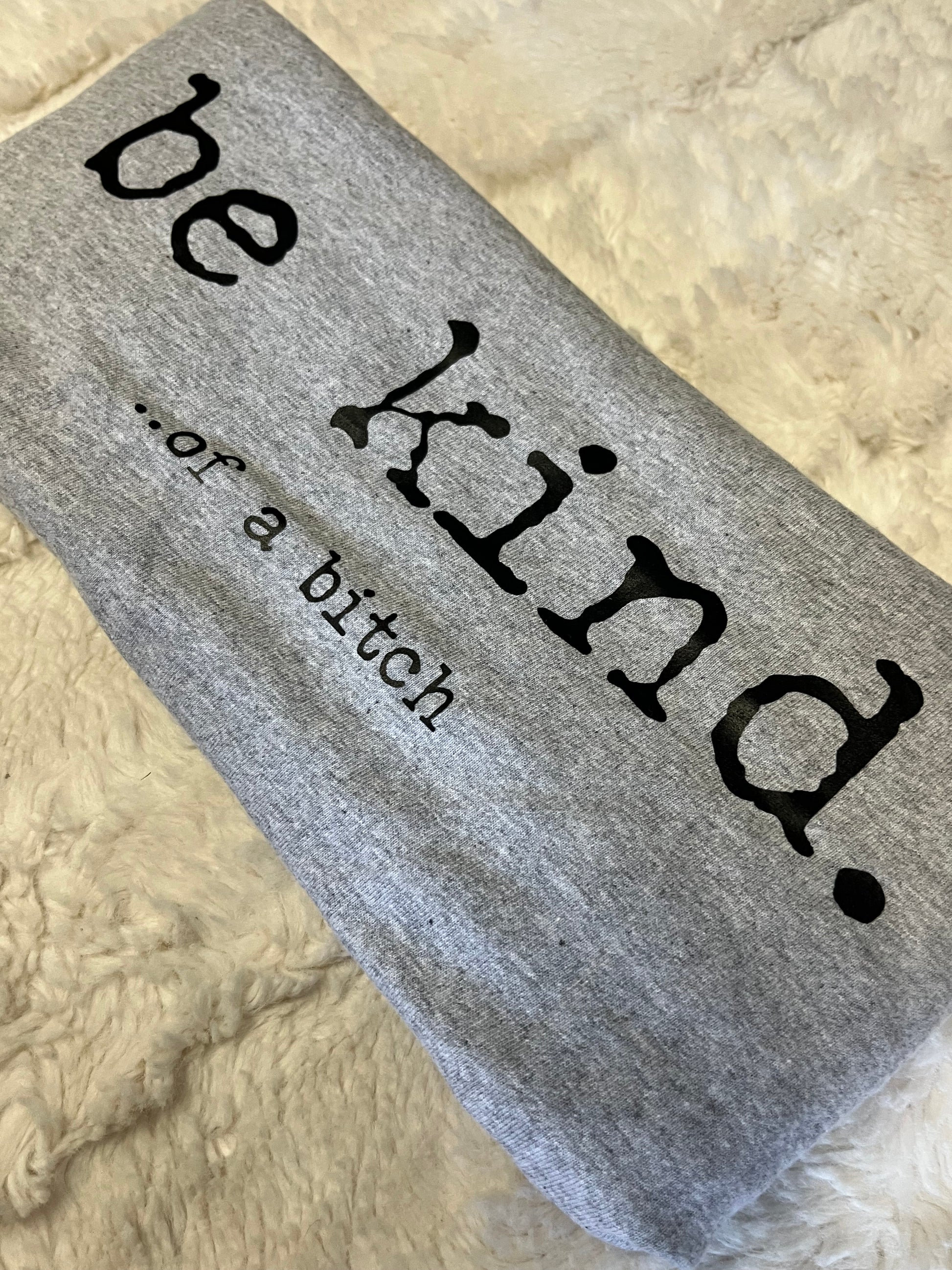- Features the phrase “be kind.” in a simple, typewriter-style font with the witty follow-up “…of a bitch” just below — creating the perfect blend of sarcasm and real talk. The minimal black print on a soft gray tee keeps the look effortlessly cool and unapologetically honest.