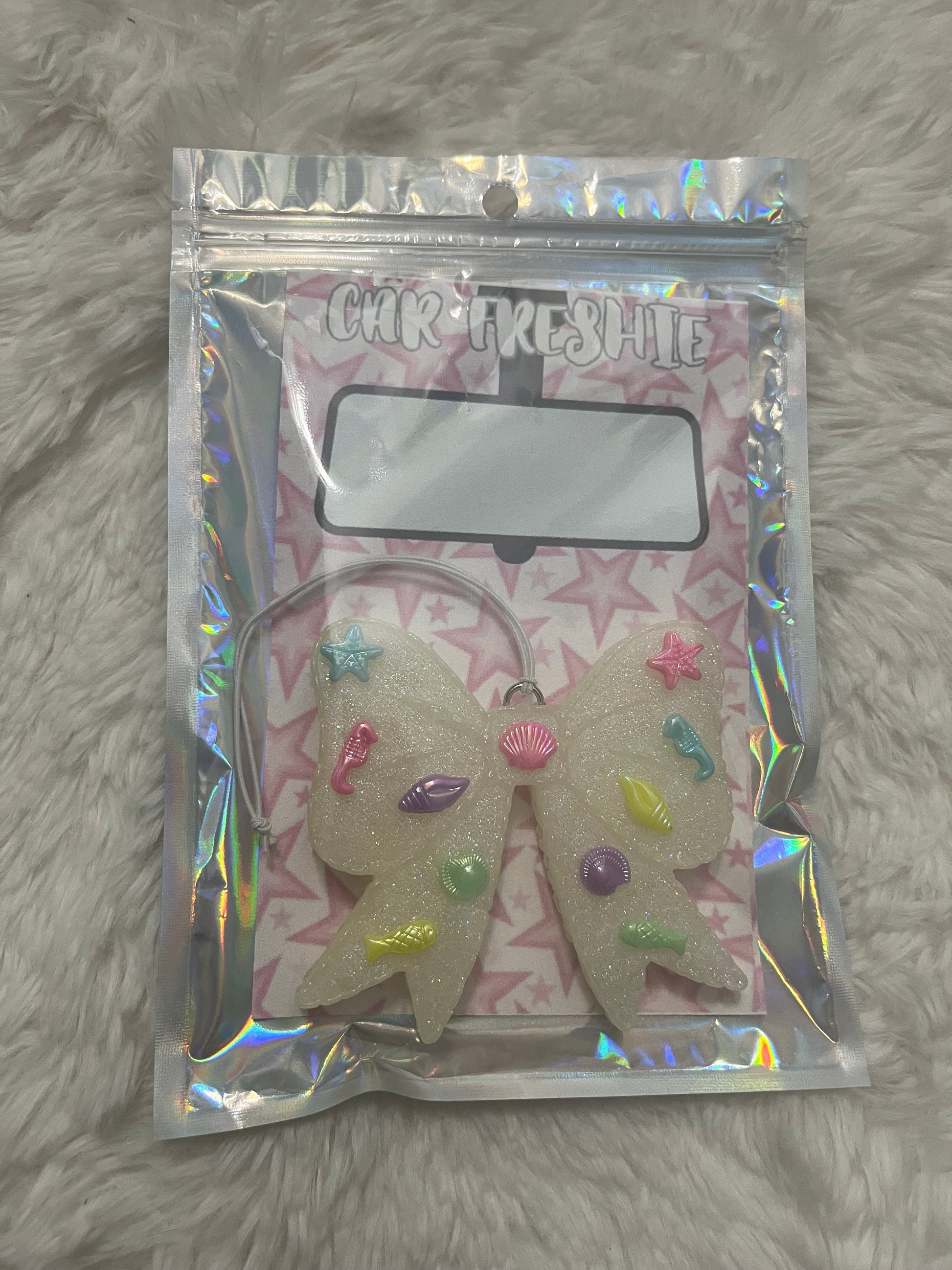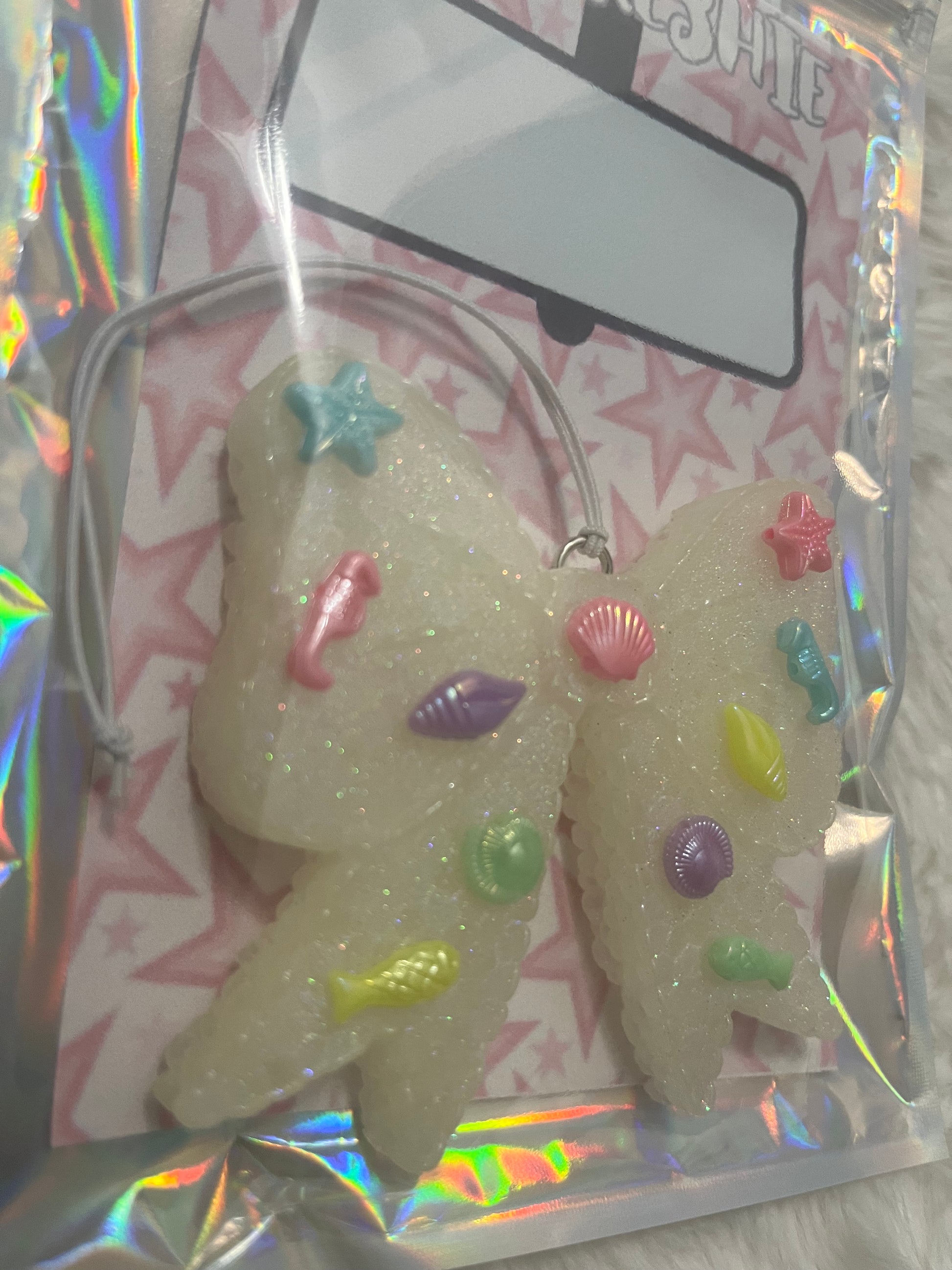 Add a splash of whimsy to your space with this sparkly mermaid-inspired bow freshie. Decorated with colorful seashells, starfish, and tiny fish, it’s a beach day in the form of a fragrance—perfect for your car, locker, or anywhere that needs a dose of coastal charm.