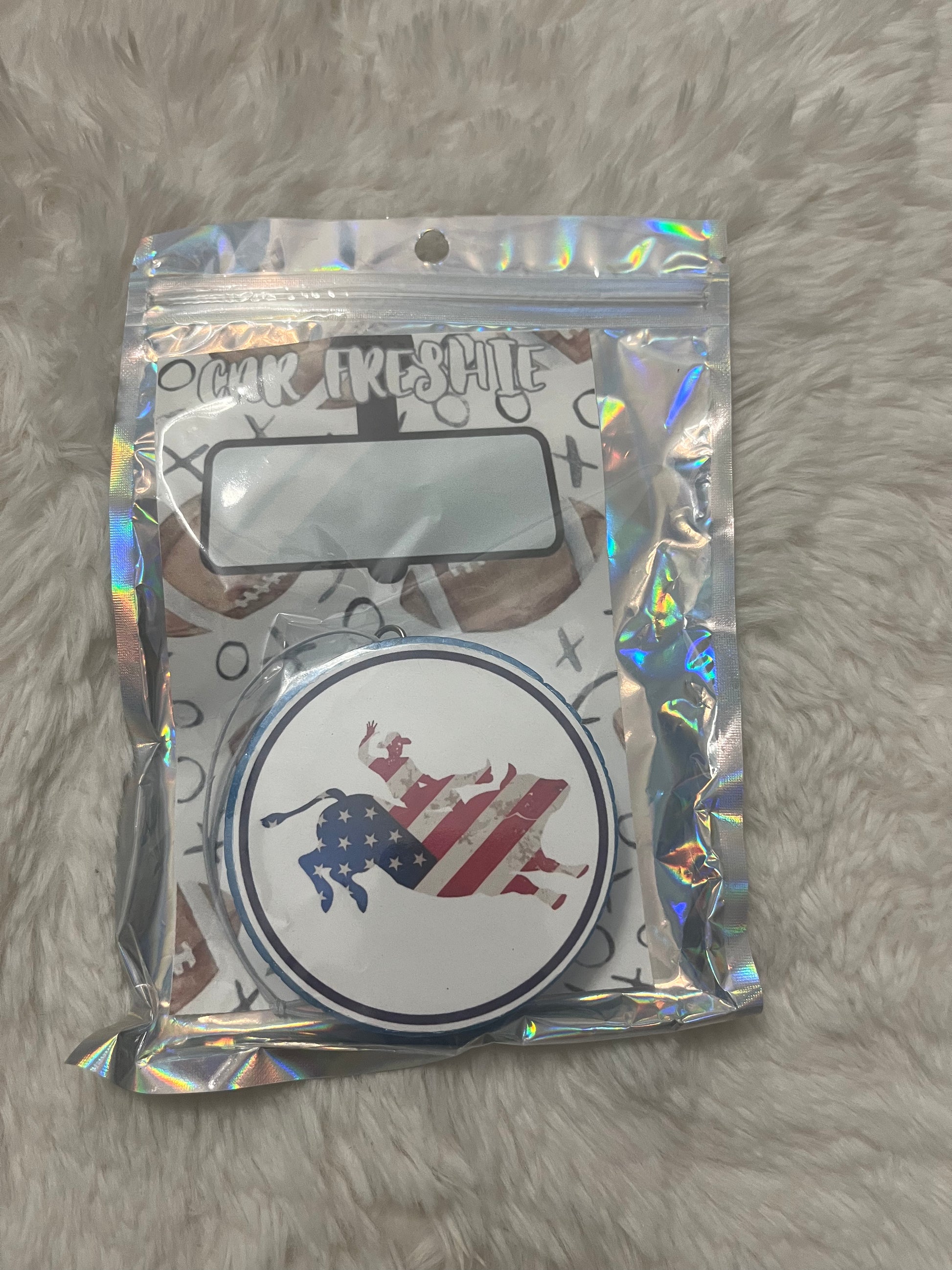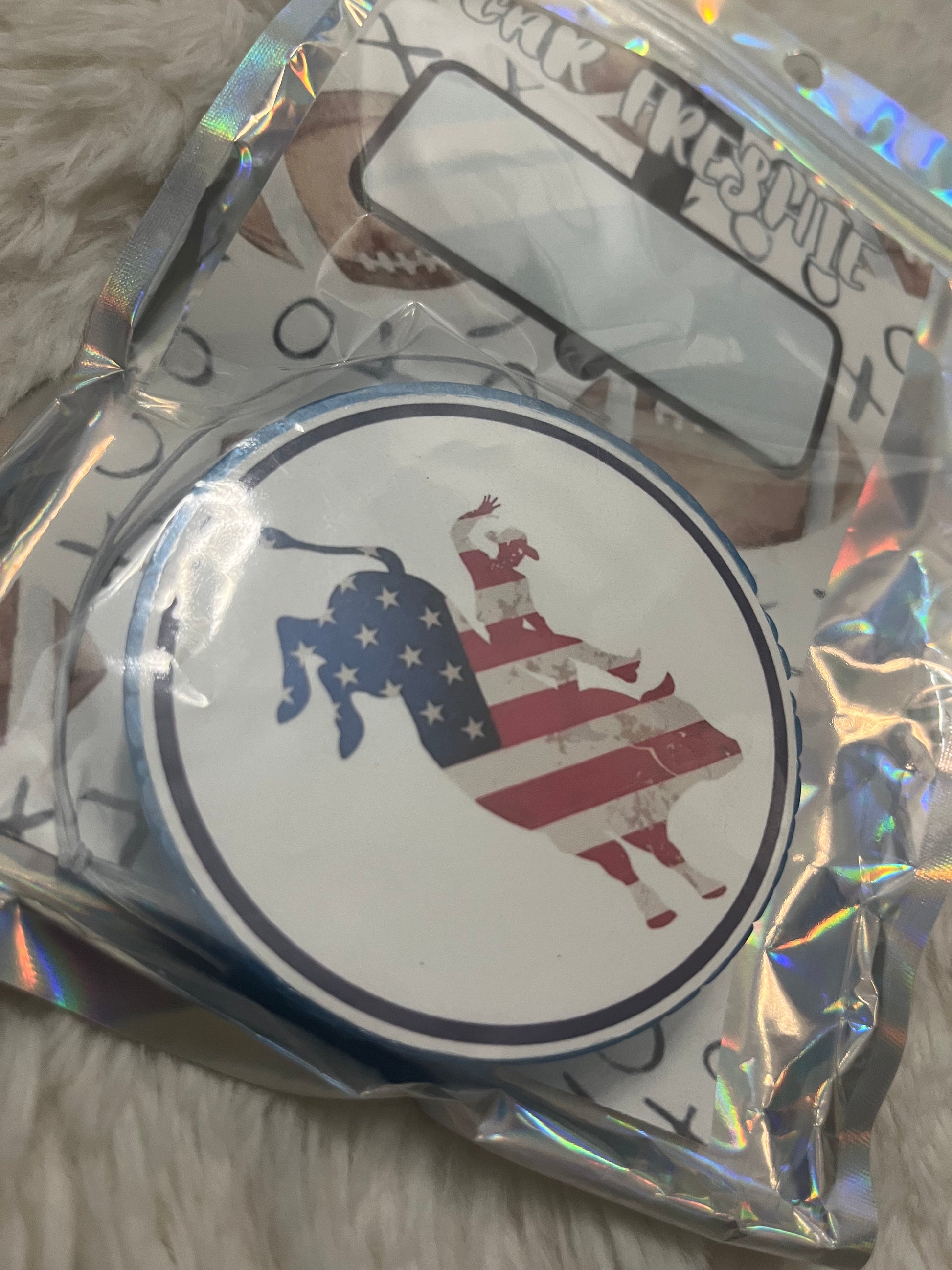 Saddle up your senses with this patriotic cowboy car freshie, featuring a bold red, white, and blue rodeo design. Perfect for truck lovers, rodeo fans, or anyone who wants to bring a little Western pride to their ride.