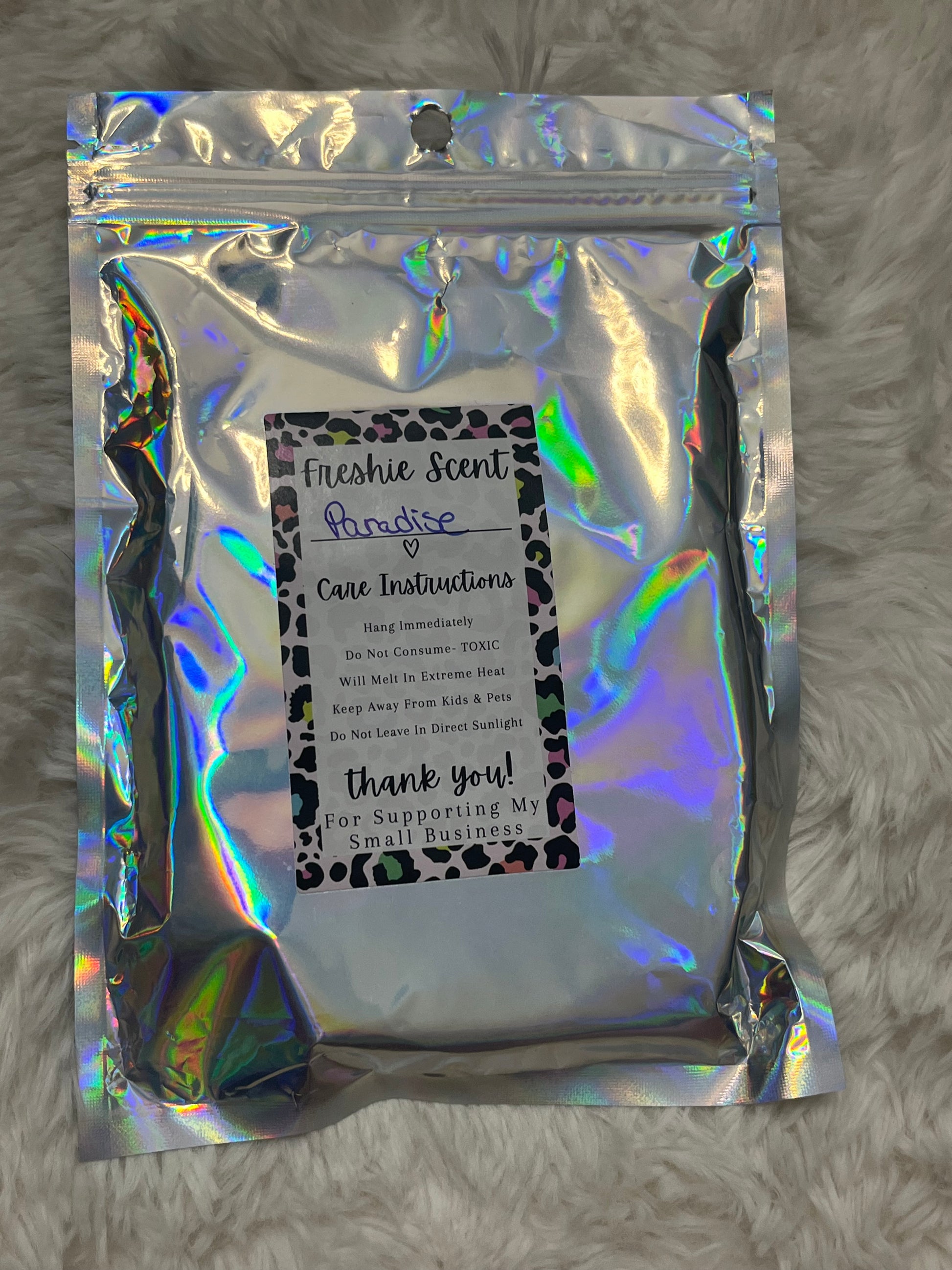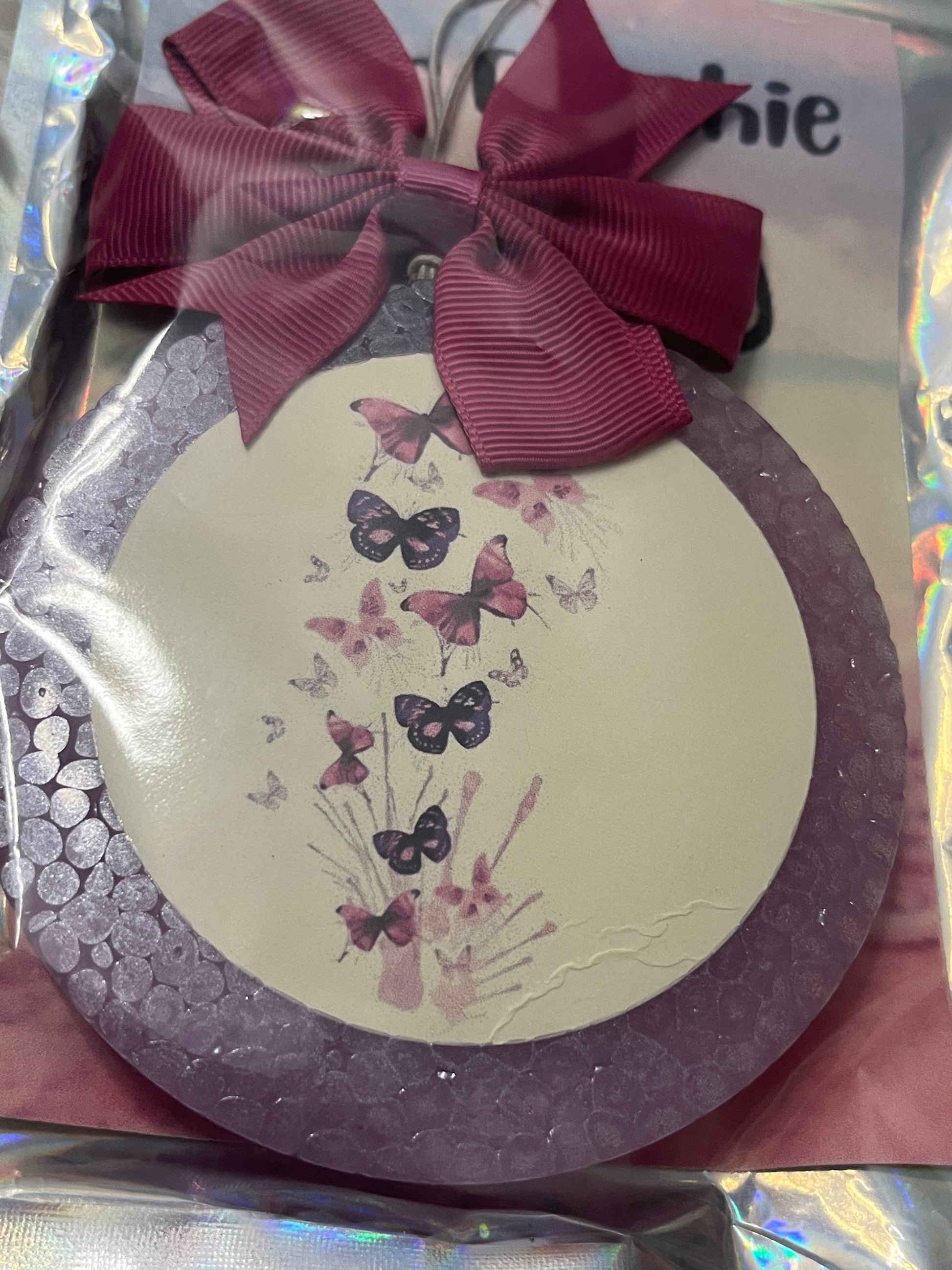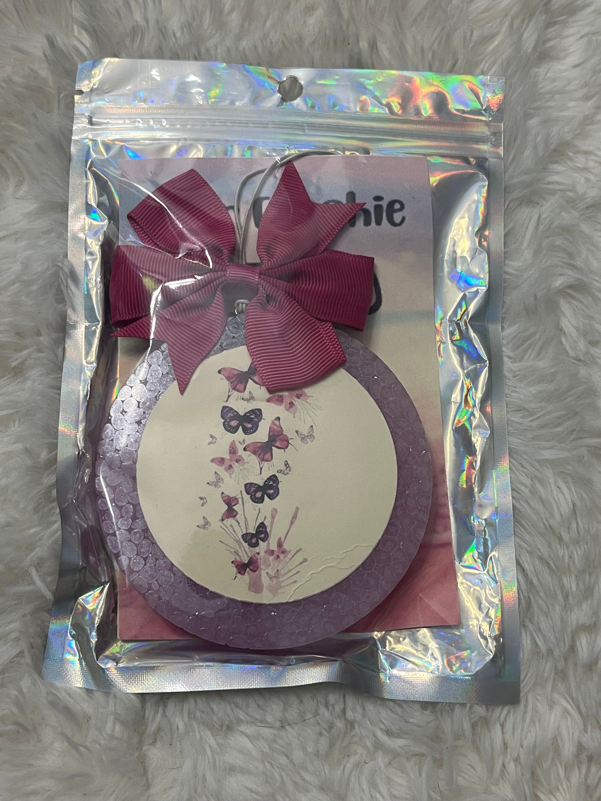 Add a soft, whimsical touch to your ride with this charming butterfly car freshie, framed in glittery purple and topped with a matching bow. The delicate flutter of pink and violet butterflies makes it perfect for anyone who loves pretty details and sweet, feminine vibes.