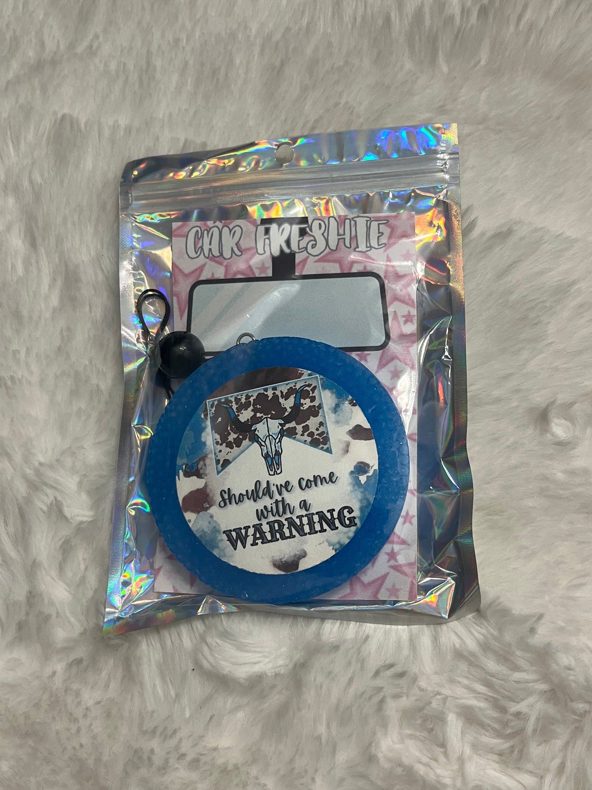 Turn heads and spark a smile with this bold “Should’ve Come with a Warning” freshie. Featuring a cowhide-print flag and steer skull design framed in a vibrant blue border, this piece brings rustic charm with a side of sass to your ride.