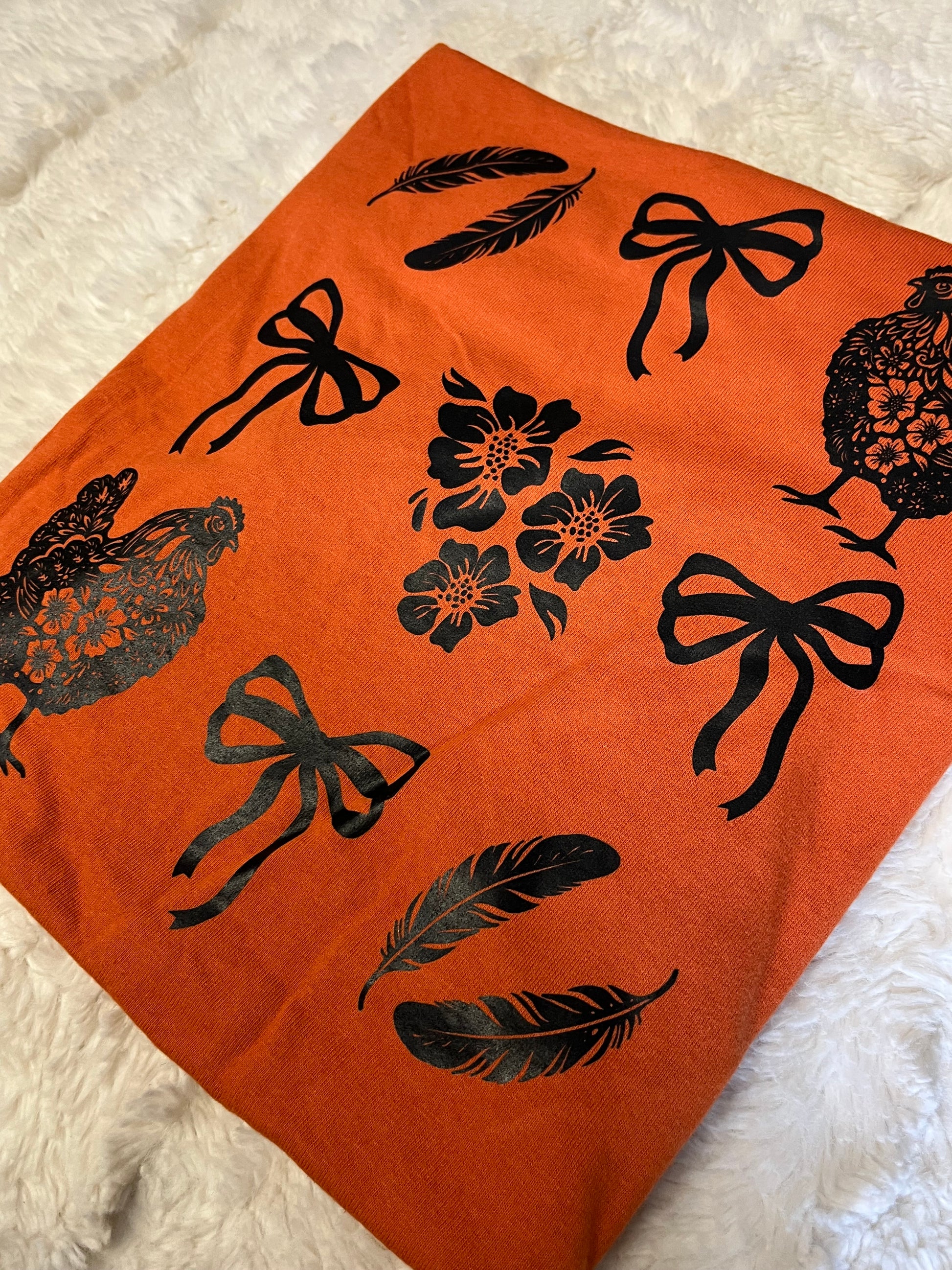 - Printed in rich black ink on a warm burnt orange base, this sweatshirt features a mix of detailed floral chickens, delicate bows, and feathers — perfectly balanced between rustic and cute. The layout gives it a hand-crafted, small-town-with-style feel that’s as charming as it is unique.
