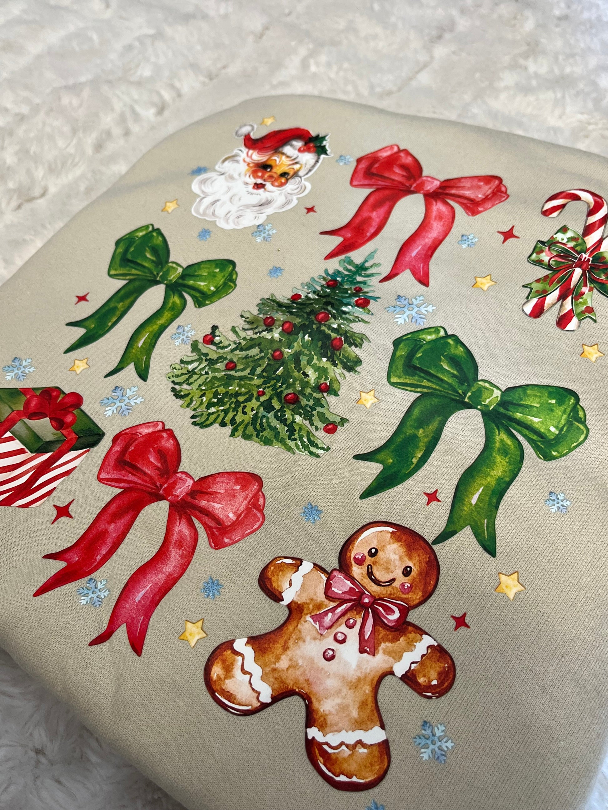 - A collage of classic Christmas favorites — Santa, candy canes, red and green bows, a decorated tree, gingerbread man, and wrapped presents — all printed in rich, retro tones with golden stars and snowflakes scattered throughout. The artwork pops beautifully against the soft neutral base for a timeless holiday feel.