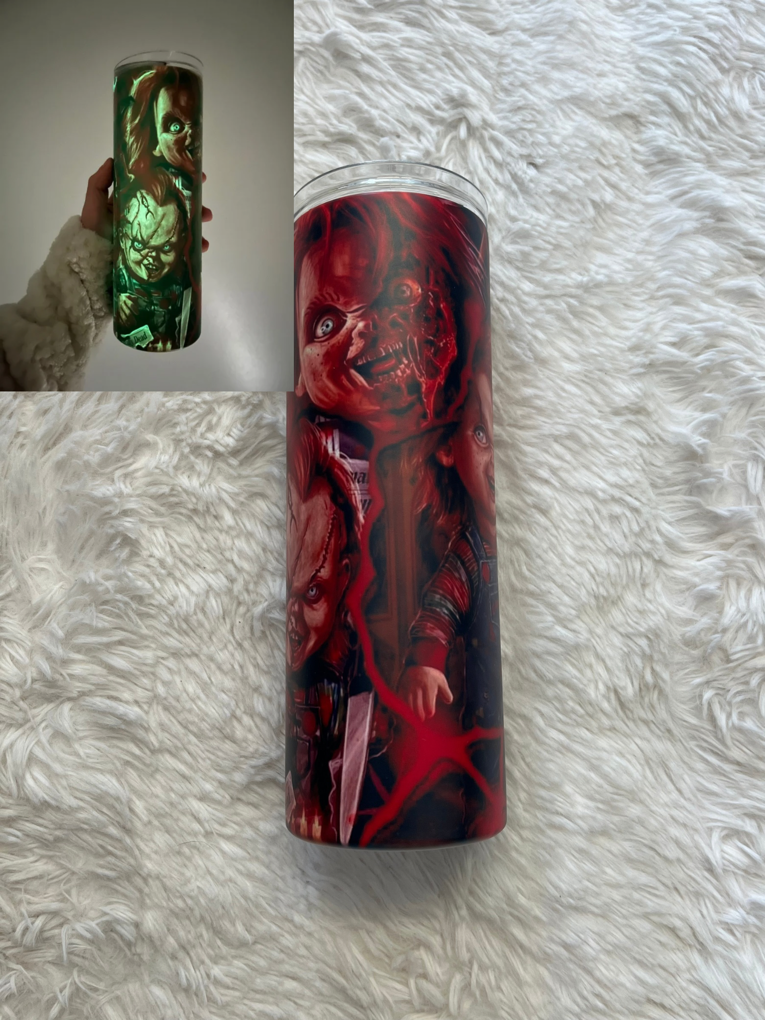 Show off your killer style with the “Chucky” glow-in-the-dark tumbler — a bold tribute to everyone’s favorite possessed doll. Featuring chilling red tones and detailed artwork that lights up when the lights go down, this tumbler is perfect for horror fans who like their drinks with a side of mischief.