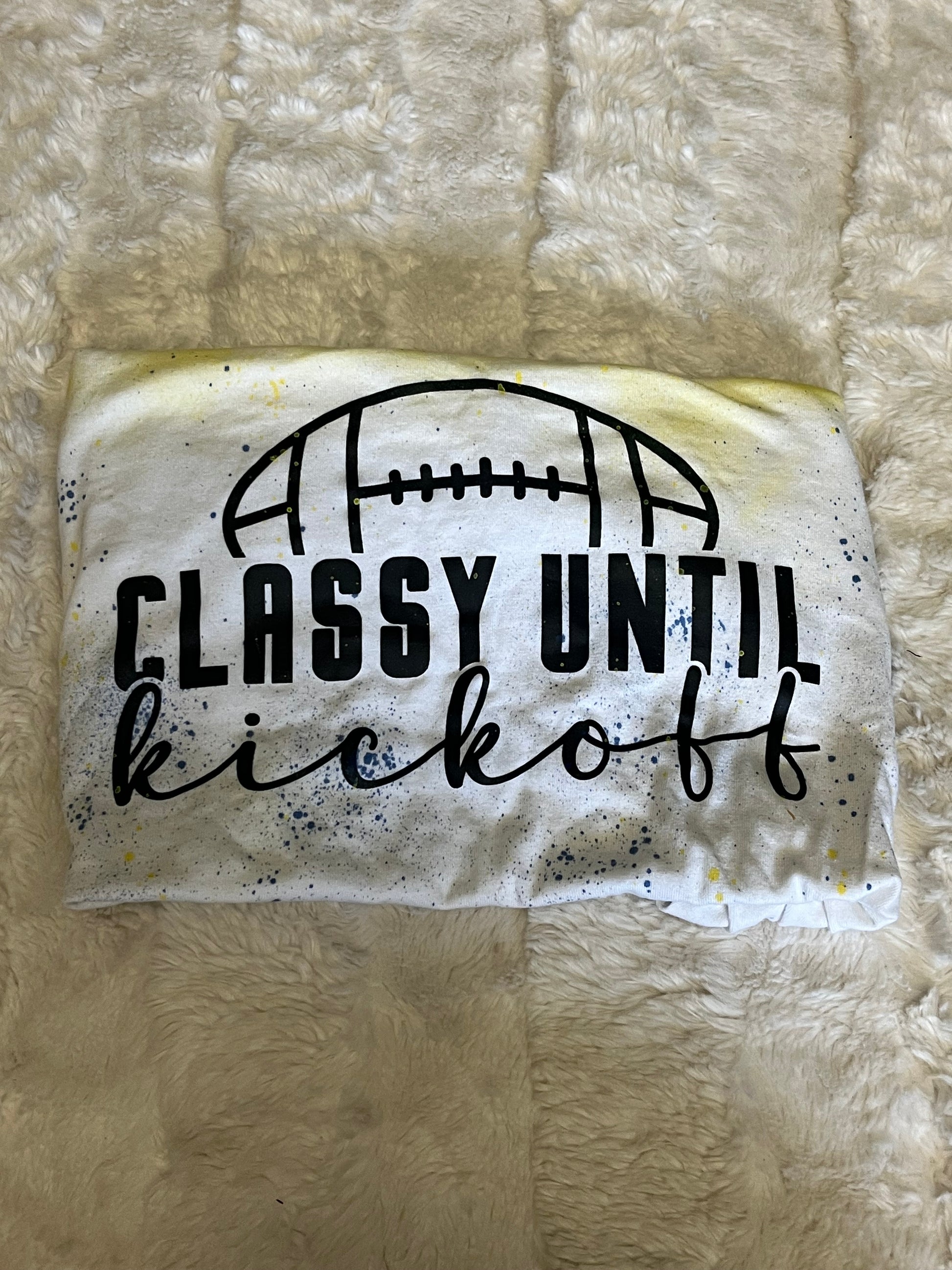 Perfect for football season, this shirt says what every true fan is thinking! The “Classy Until Kickoff” tee combines sporty attitude with effortless style, making it the go-to top for game days, tailgates, or cheering from home.