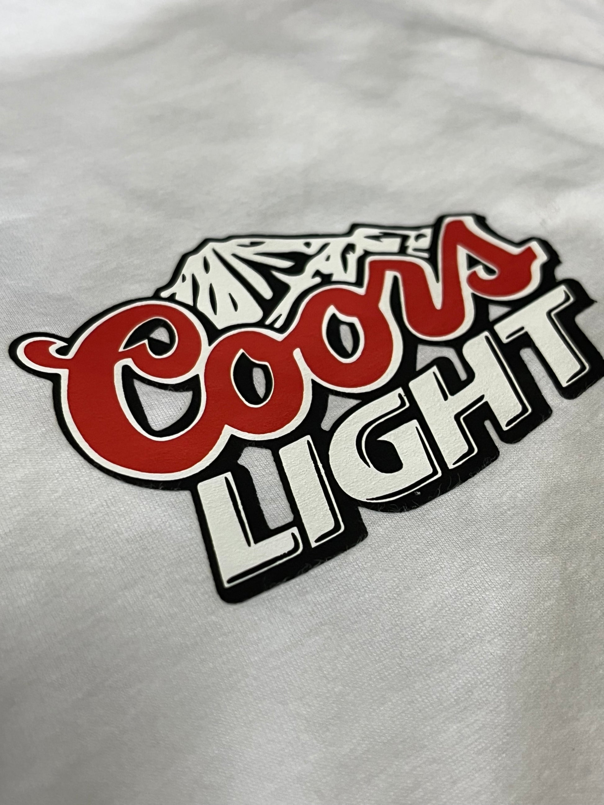 - The front of the shirt features the bold red and silver Coors Light logo with mountain detailing — subtle enough for everyday wear, but recognizable enough to make a statement.