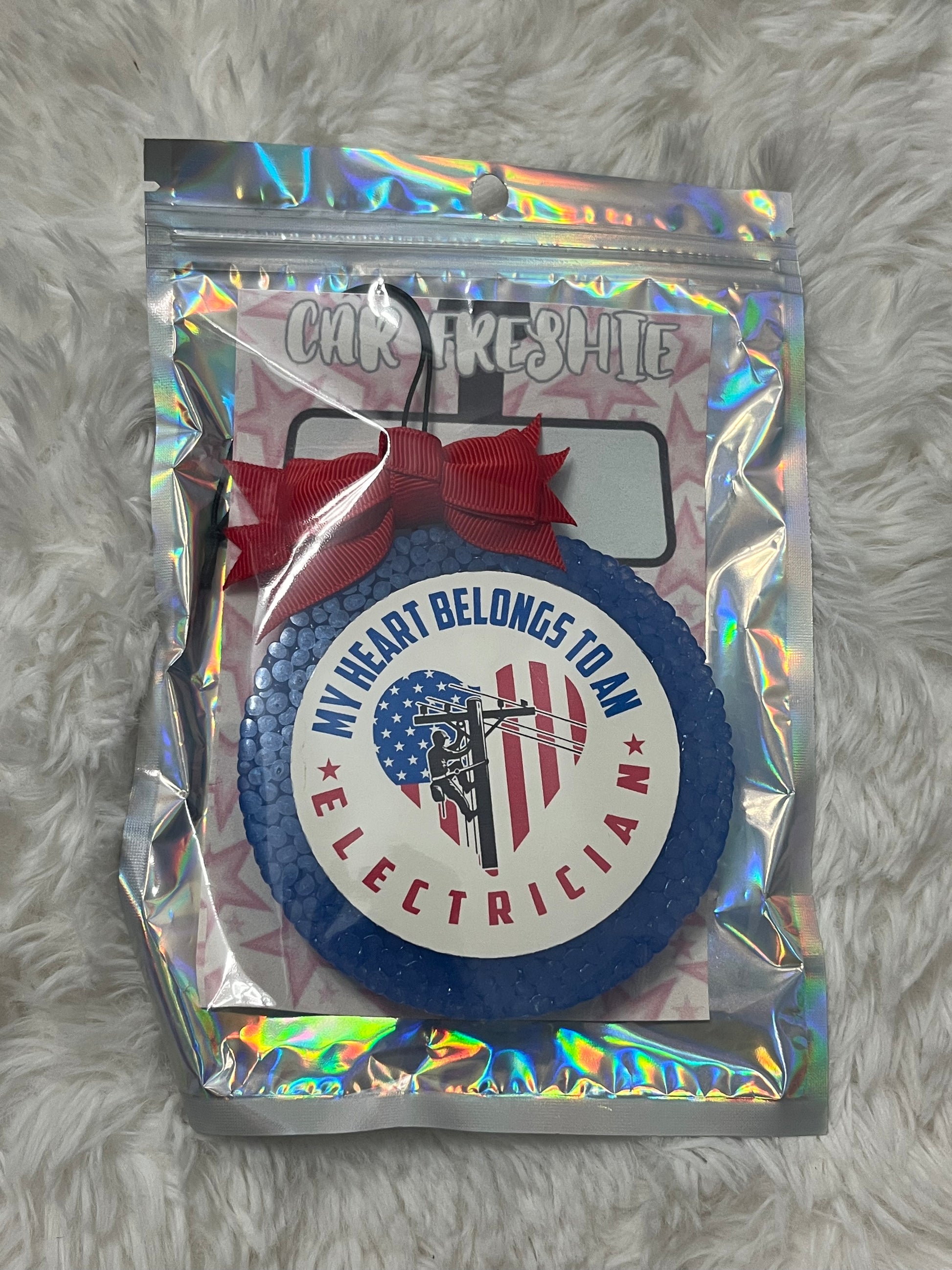 Show off your love while keeping your ride smelling amazing with this bold My Heart Belongs to an Electrician car freshie. Finished in deep blue with a patriotic design and topped with a bright red bow, it’s the perfect mix of charm and freshness.
