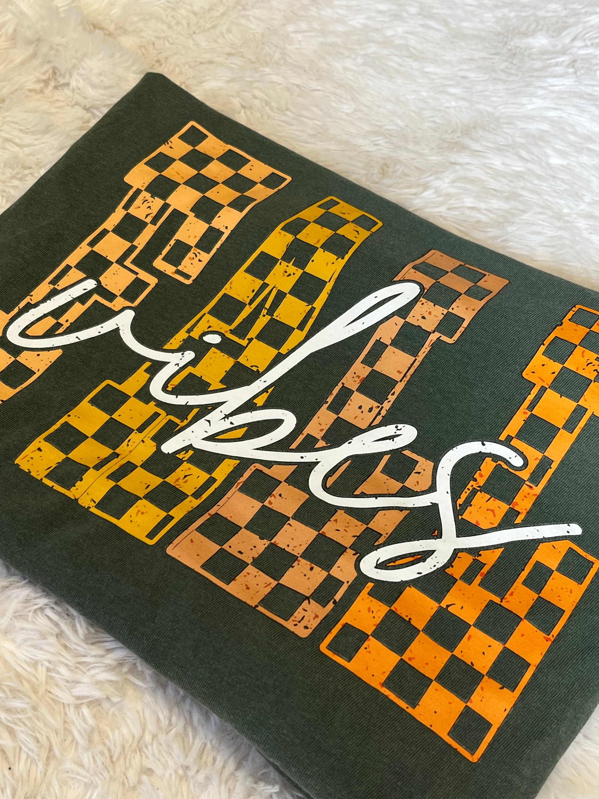 Embrace cozy season energy with this bold and cheerful “Vibes” tee! The deep forest green backdrop perfectly complements the warm yellow, orange, and tan checkerboard design, while the crisp white script adds that touch of effortless cool.