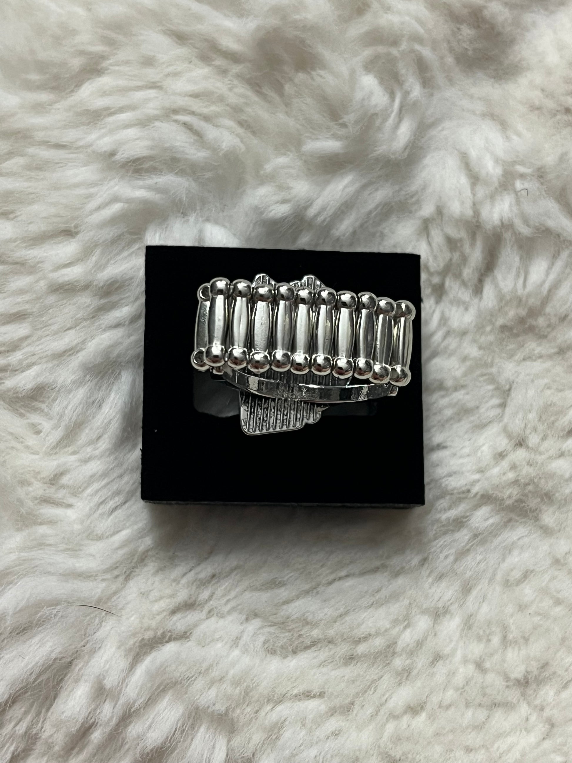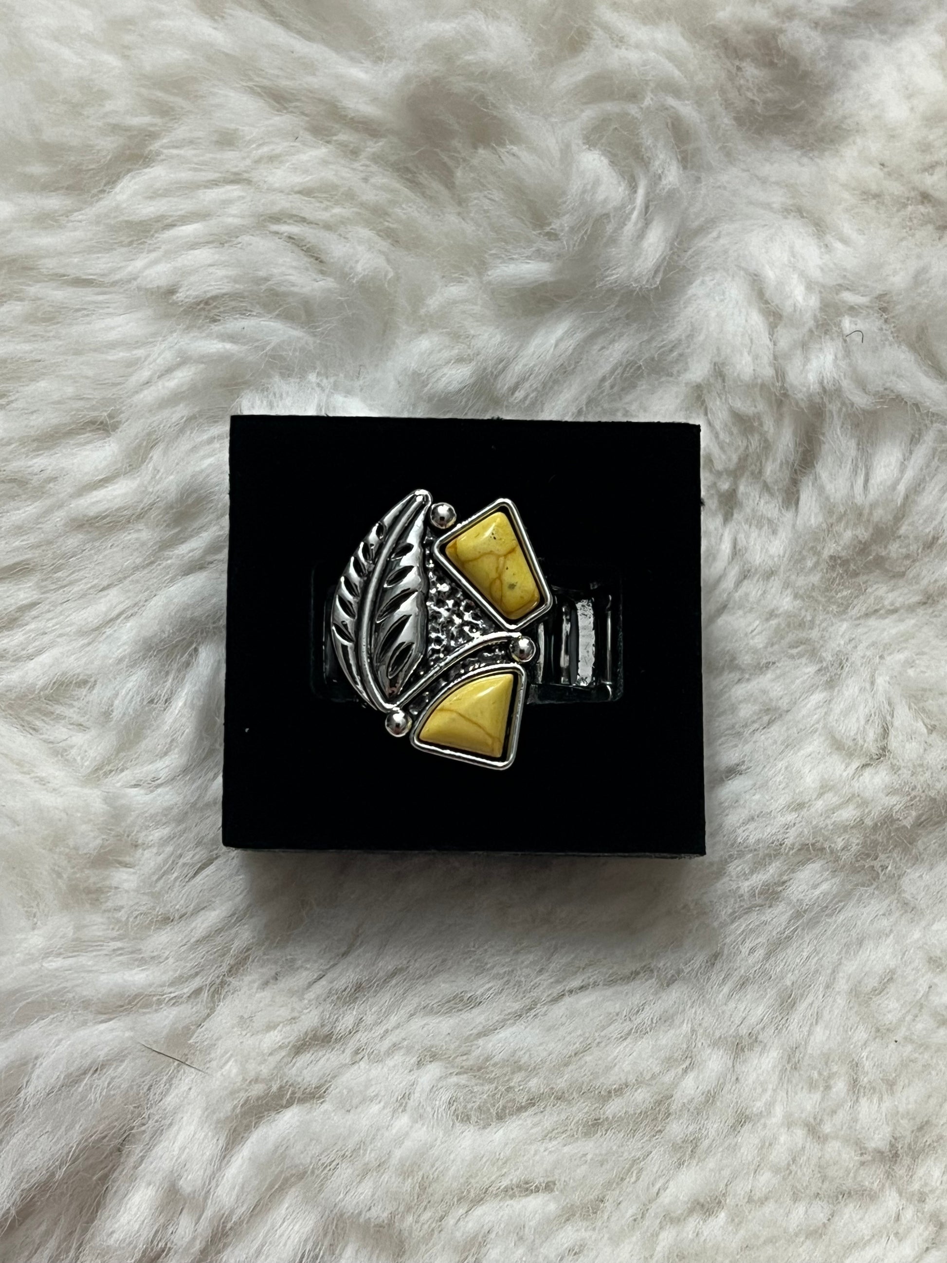 Channel desert dreams with this feather ring, a silver-tone stunner that blends bold texture with a pop of fiery color. Featuring yellow stones set against layered feather and beaded detailing, this ring brings earthy flair and free-spirited charm to every outfit.