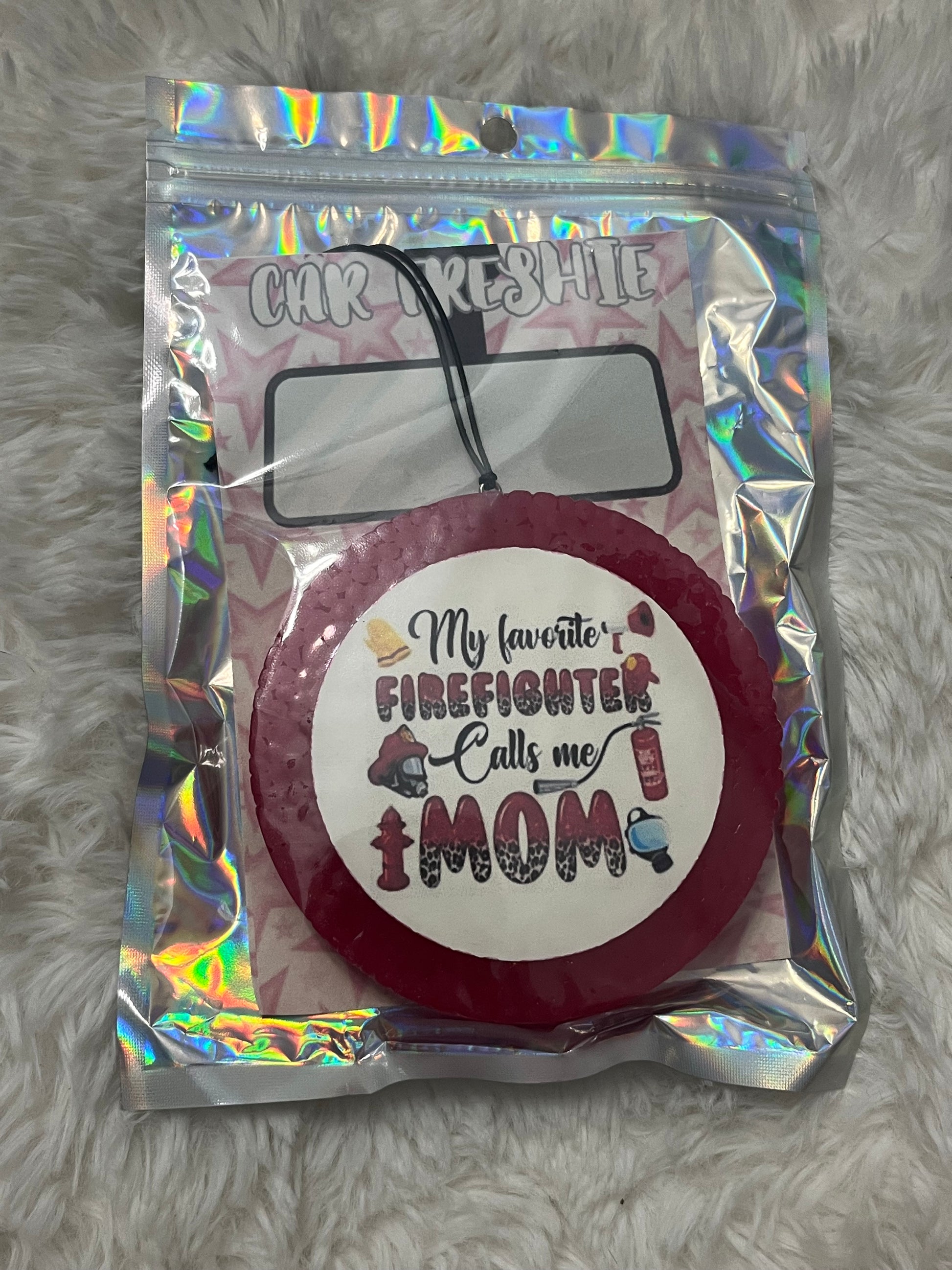 Celebrate your pride in the bravest profession with this “My Favorite Firefighter Calls Me Mom” car freshie. With its bold red base, fun firefighter-themed details, and heartfelt message, it’s the perfect way to show off your love while keeping your space smelling amazing.