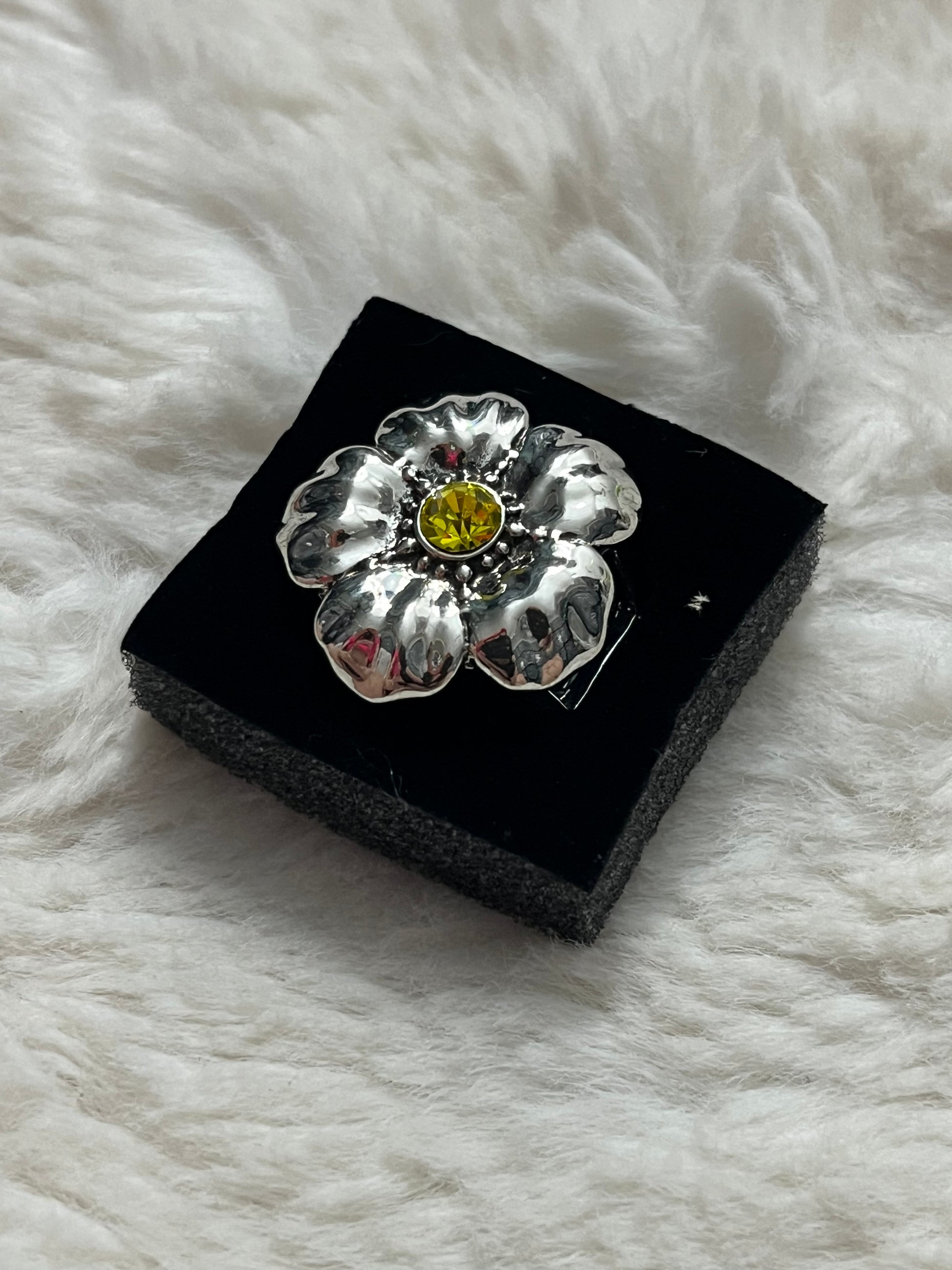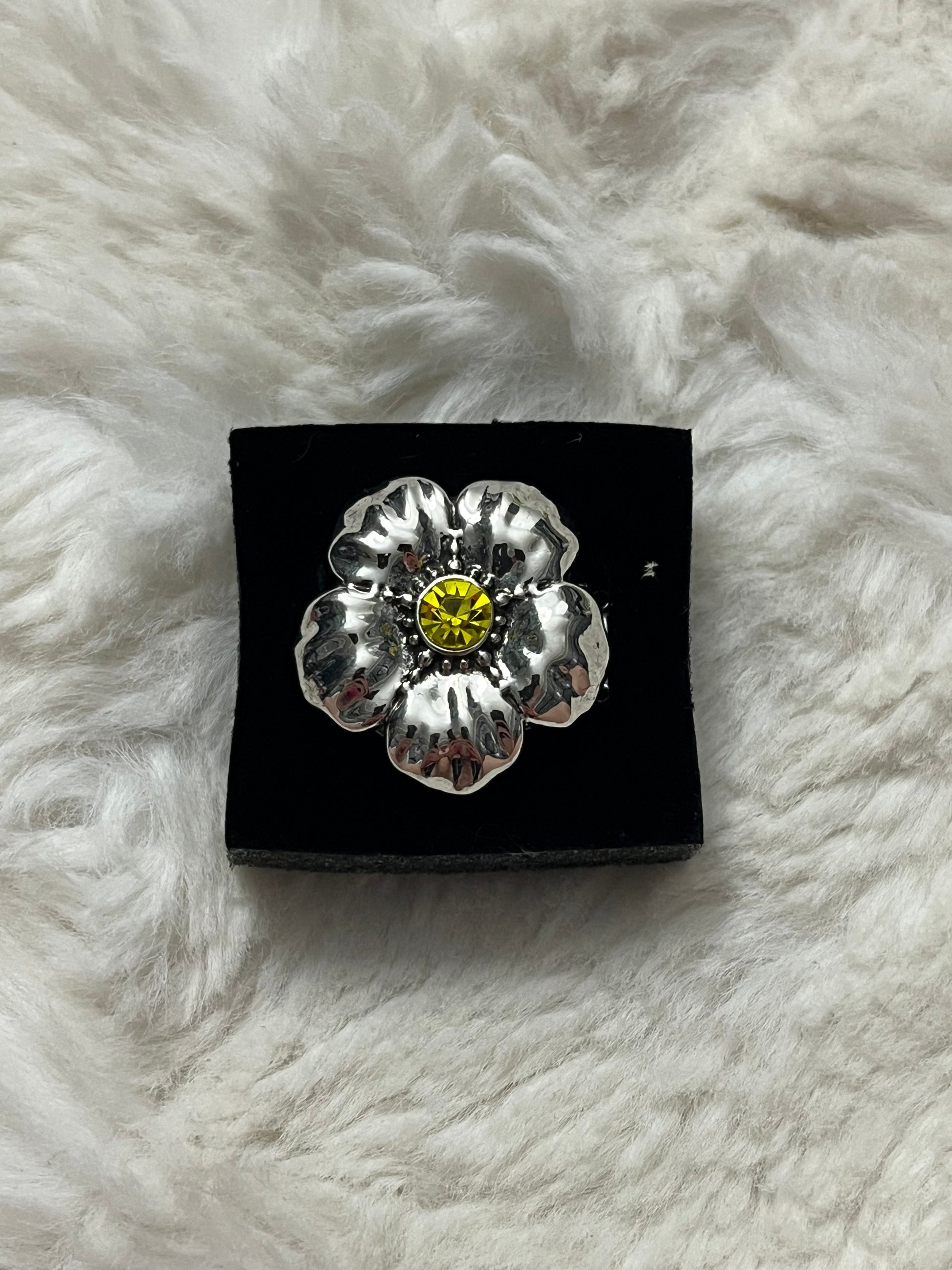 Make a subtle yet striking statement with the Daisy Shine Ring. Designed with a polished silver flower and a brilliant yellow crystal at its center, this ring brings playful charm and timeless elegance together. The petal details catch the light beautifully, making it a perfect piece for both everyday wear and special occasions.