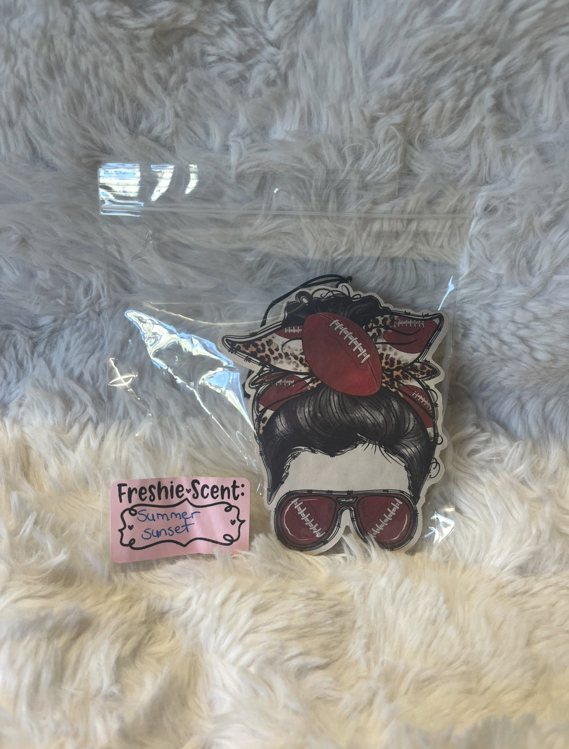 Have your car smelling real good with this football mom car freshie hanging from your rearview mirror! Scented in Summer Sunset: a blend of amber, vanilla, honeysuckle, jasmine, salt, guava, papaya, orange, and pineapple to create a warm and relaxing scent! May melt in extreme heat!