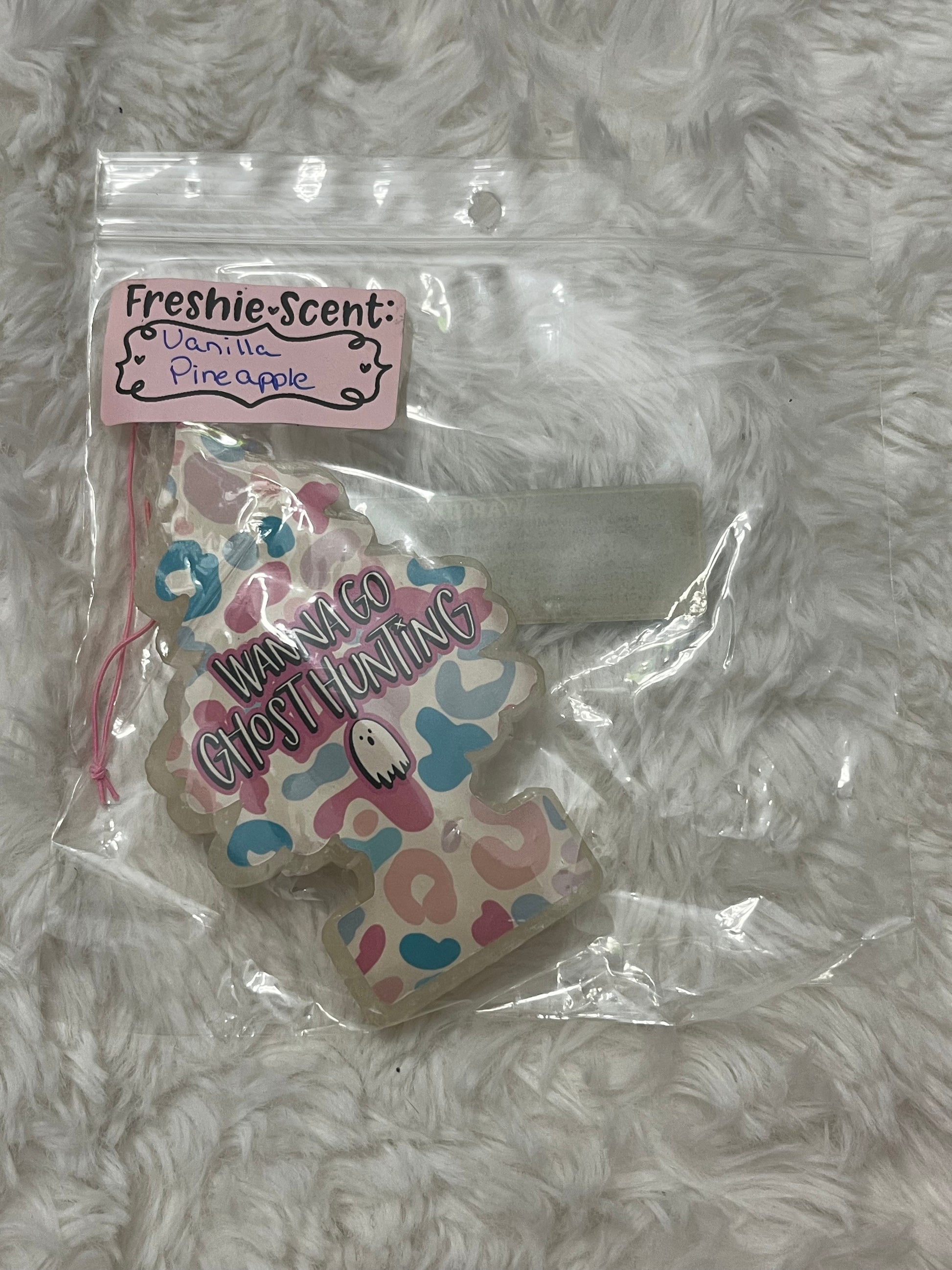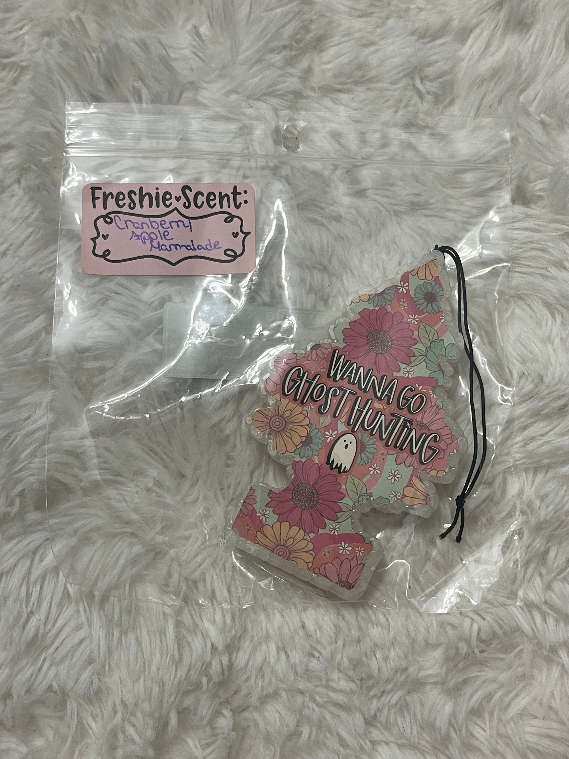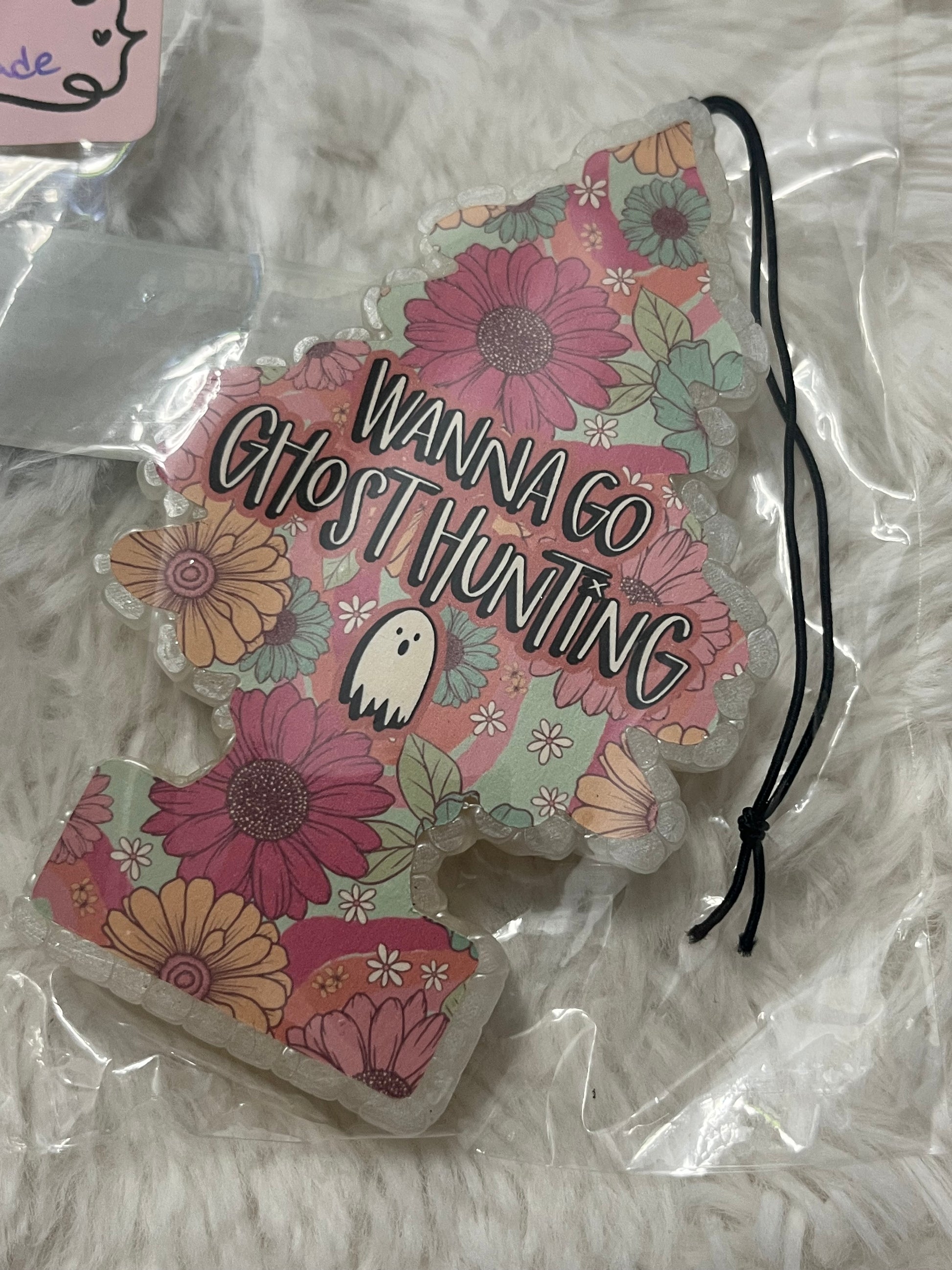 Take your ride on a spooky adventure with the “Wanna Go Ghost Hunting” Freshie! With playful ghost graphics and fun patterned designs, these freshies are perfect for anyone who loves a mix of sass, humor, and fragrance.