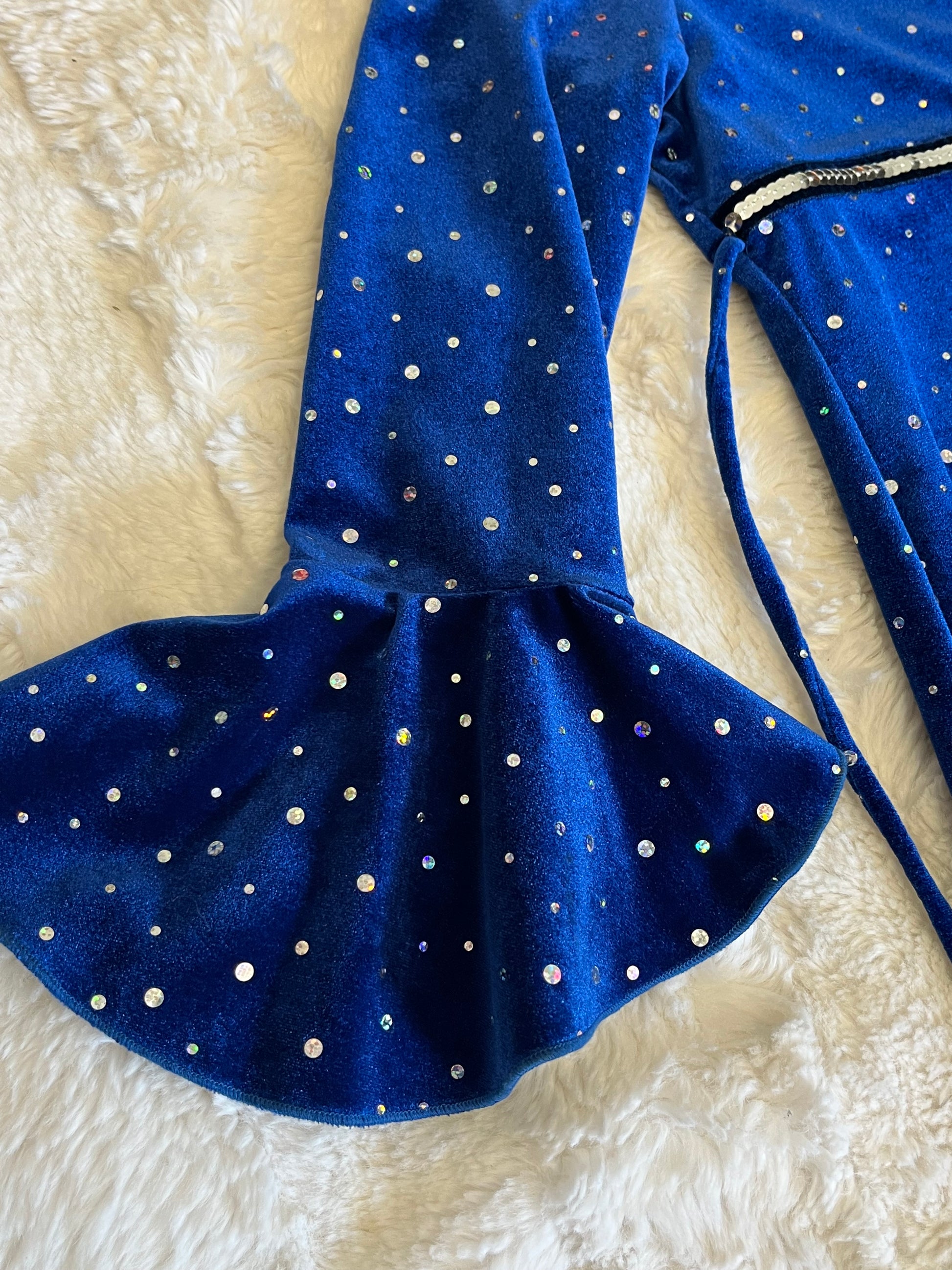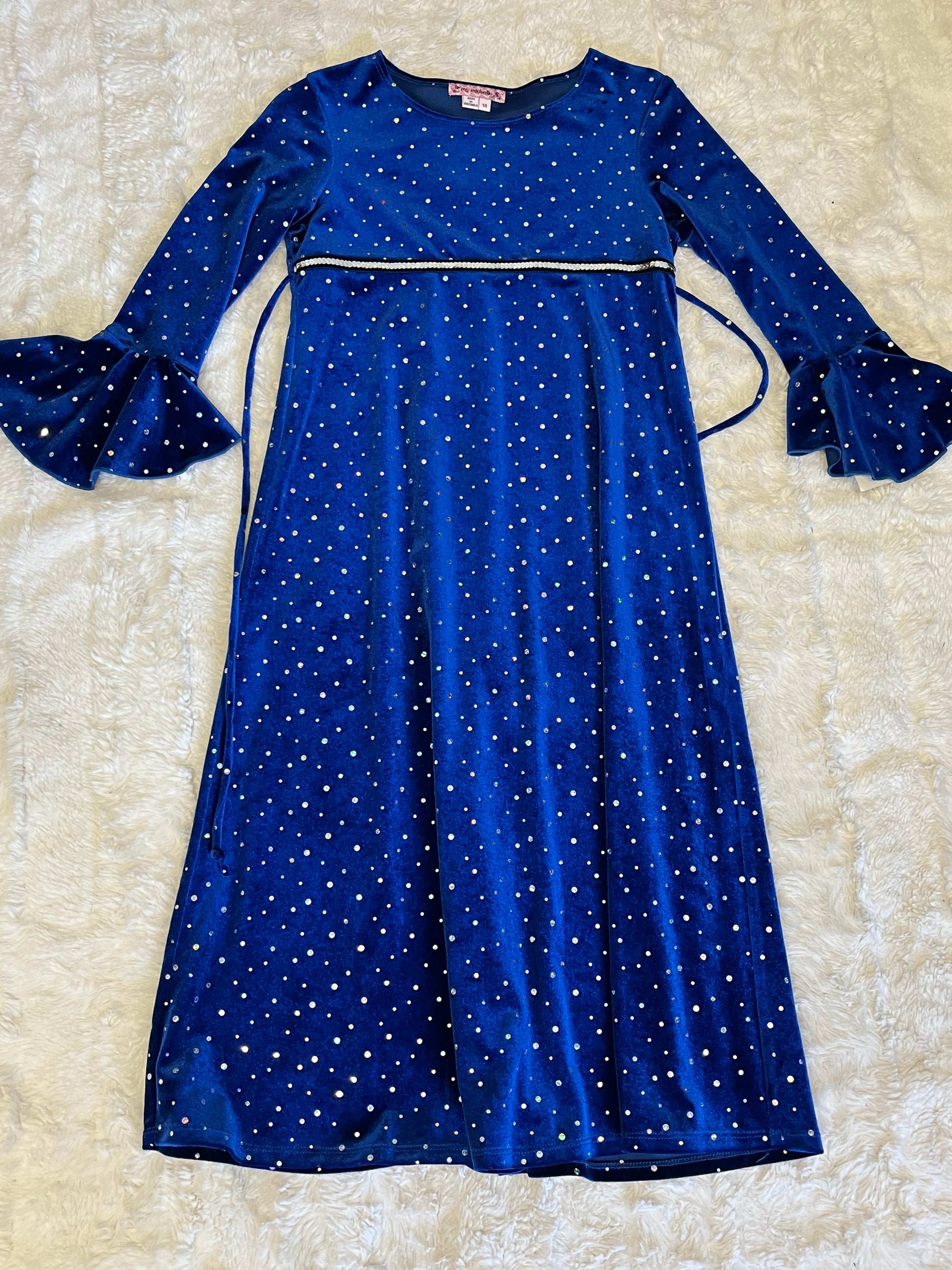 Let her shine brighter than the stars in the Starlight Dream Dress. Made from deep royal blue velvet sprinkled with sparkling rhinestones, this gown captures the magic of a starlit night. The elegant A-line shape and flared bell sleeves add a touch of drama, while the sequin-trimmed empire waist ties everything together with celestial charm.