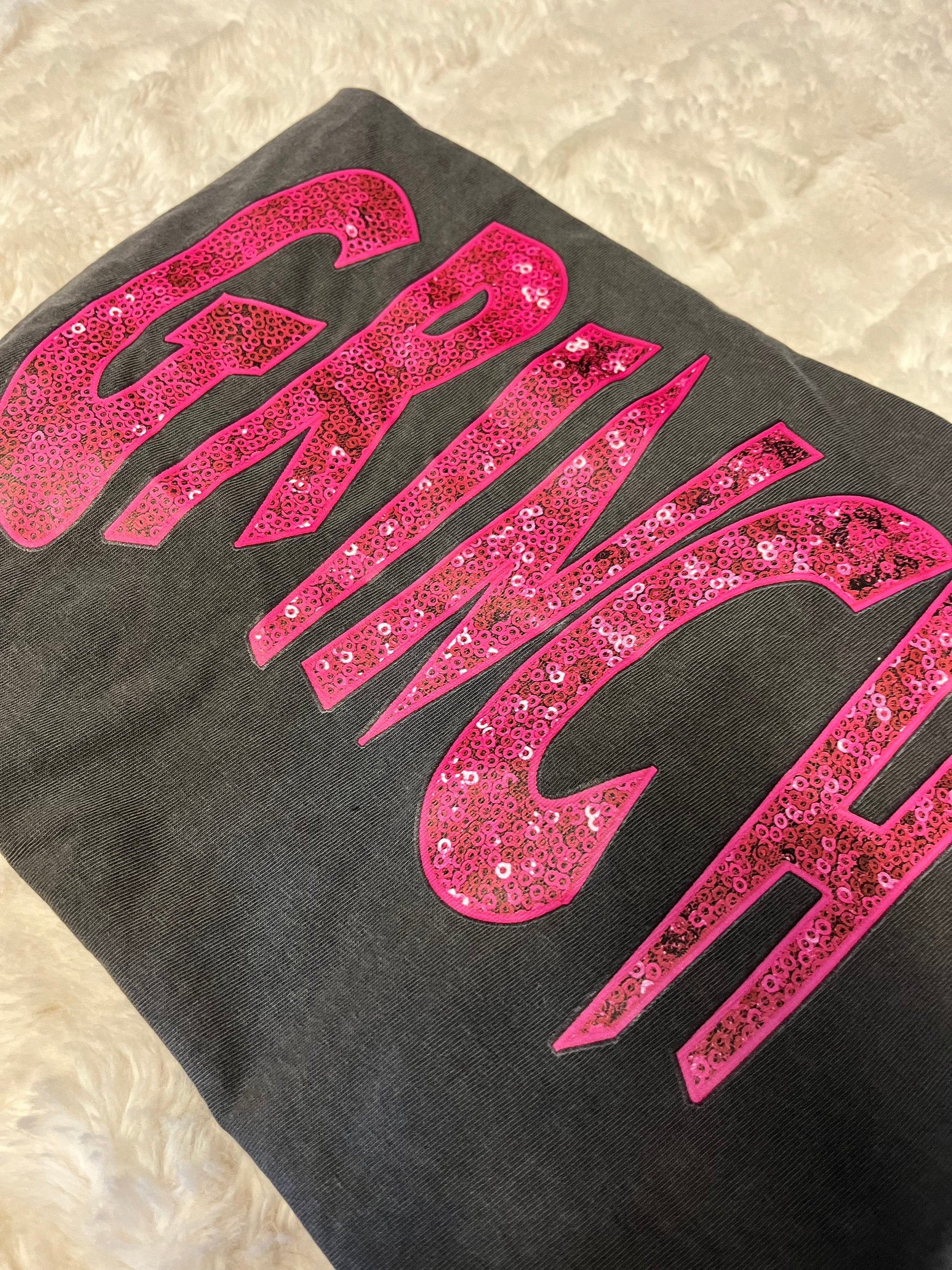- The word “GRINCH” takes center stage in bold pink sequin letters, outlined for extra pop against a cozy charcoal gray base. The glimmering sequins catch the light with every move, adding a dash of glam to everyone’s favorite grumpy holiday icon.