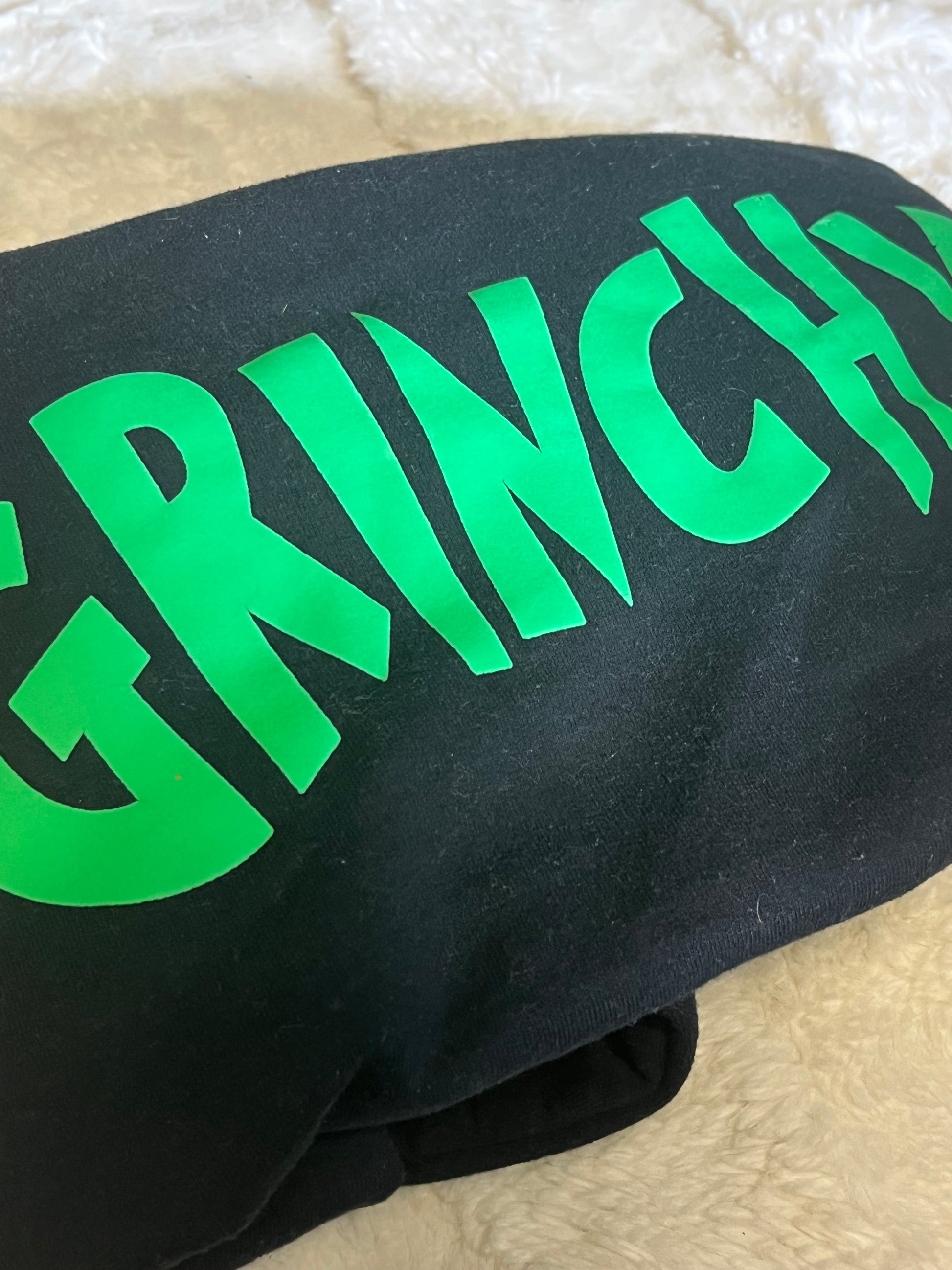 - Bold, bright green letters spell out “GRINCHY” across a deep black sweatshirt — a simple yet striking design that captures the perfect mix of cozy and chaotic holiday spirit.