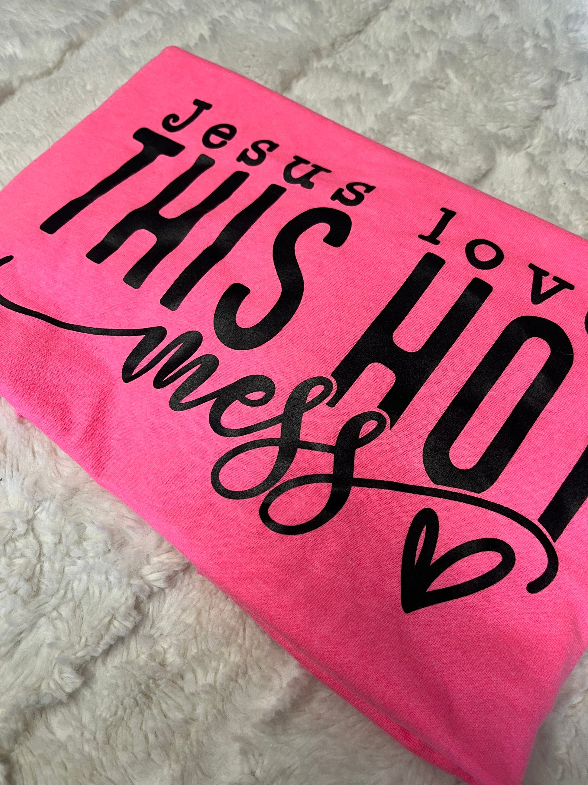 - The phrase “Jesus loves this hot mess” is printed in bold black lettering on a vibrant hot pink tee, blending playful humor with heartfelt truth. The flowing script and heart detail add a touch of sweetness to this faith-filled favorite that’s as real as it is relatable.