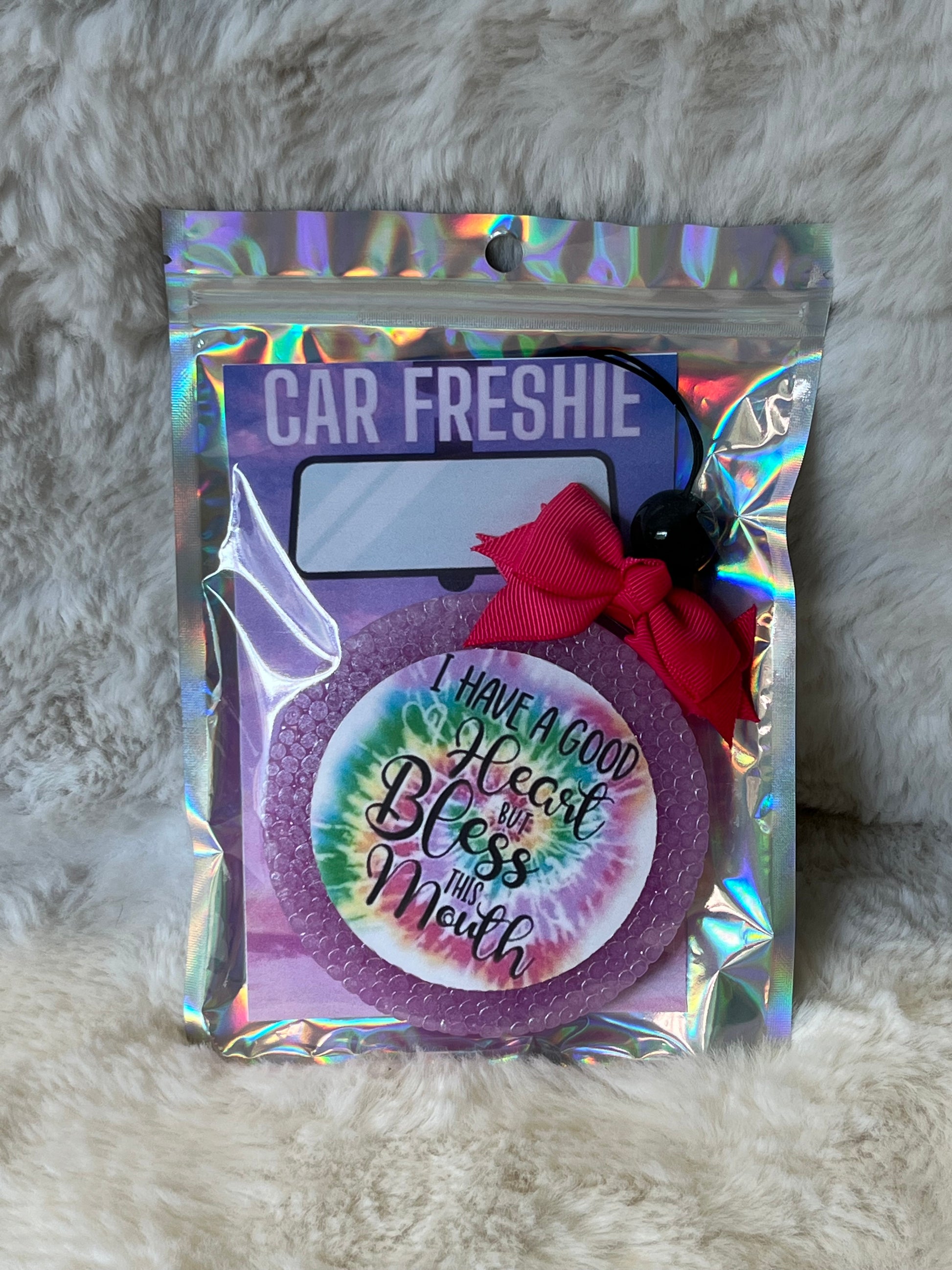 Have your car smelling real good with this “I have a good heart but bless this mouth” car freshie hanging from your rearview mirror! Scented in Strawberry! This freshie has a tie dye background with a bow and bead to top it! May melt in extreme heat!