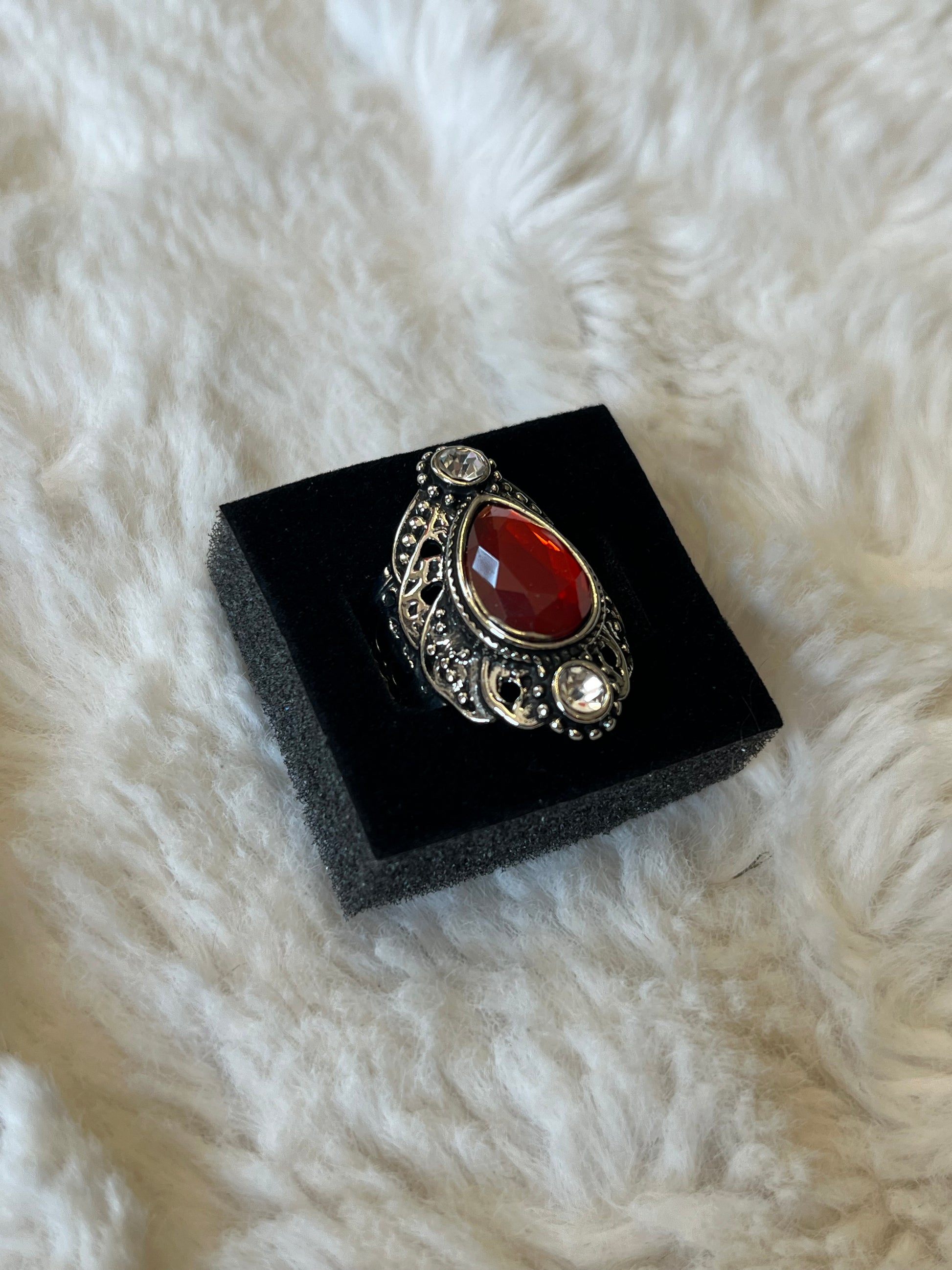 Make a subtle yet striking statement with this Crimson Ember Ring. Designed with an antique-inspired silver setting, this ring features a vivid teardrop-shaped red stone framed by intricate detailing and two brilliant clear accents. It delivers timeless style with a modern edge.