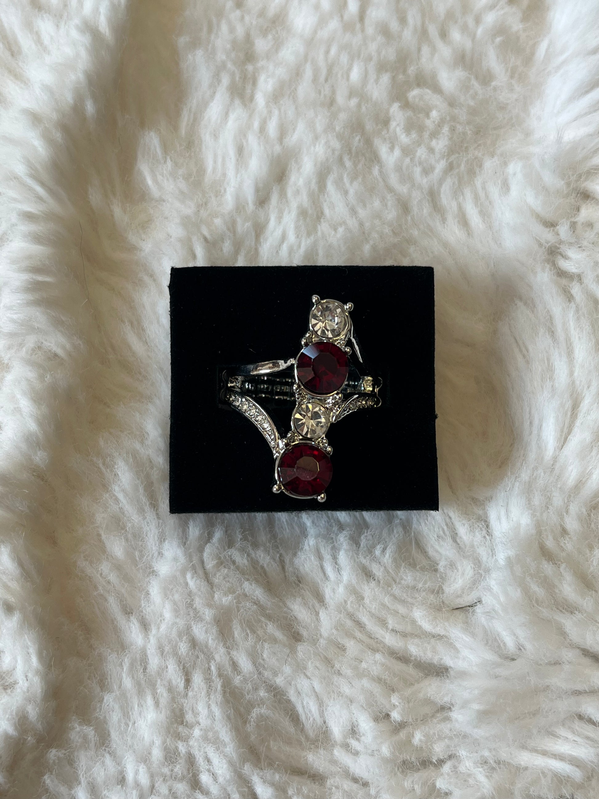 Make a subtle yet striking statement with this Garnet Elegance Ring. Designed with a silver-toned band and alternating deep red and clear stones in a vertical row, this ring delivers timeless style with a modern edge.