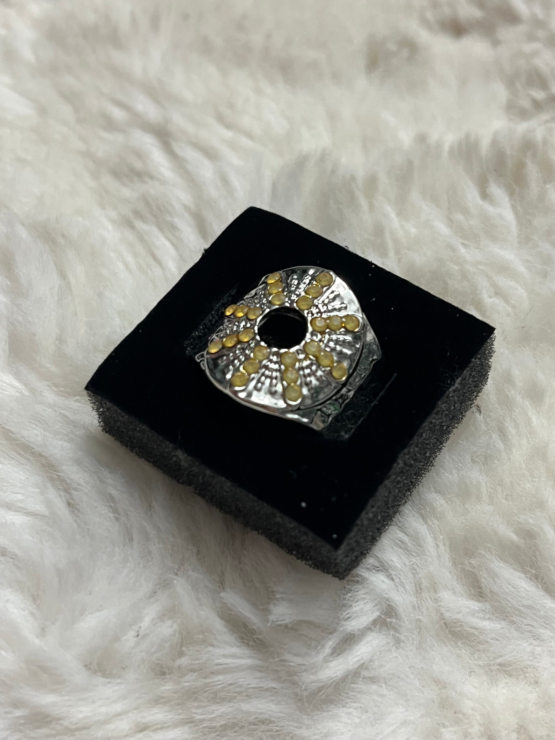 Make a subtle yet striking statement with the Radiant Burst Ring. Designed with a wide silver disc face accented by golden yellow stones in a radiant burst pattern, this ring delivers timeless style with a touch of artistic flair.