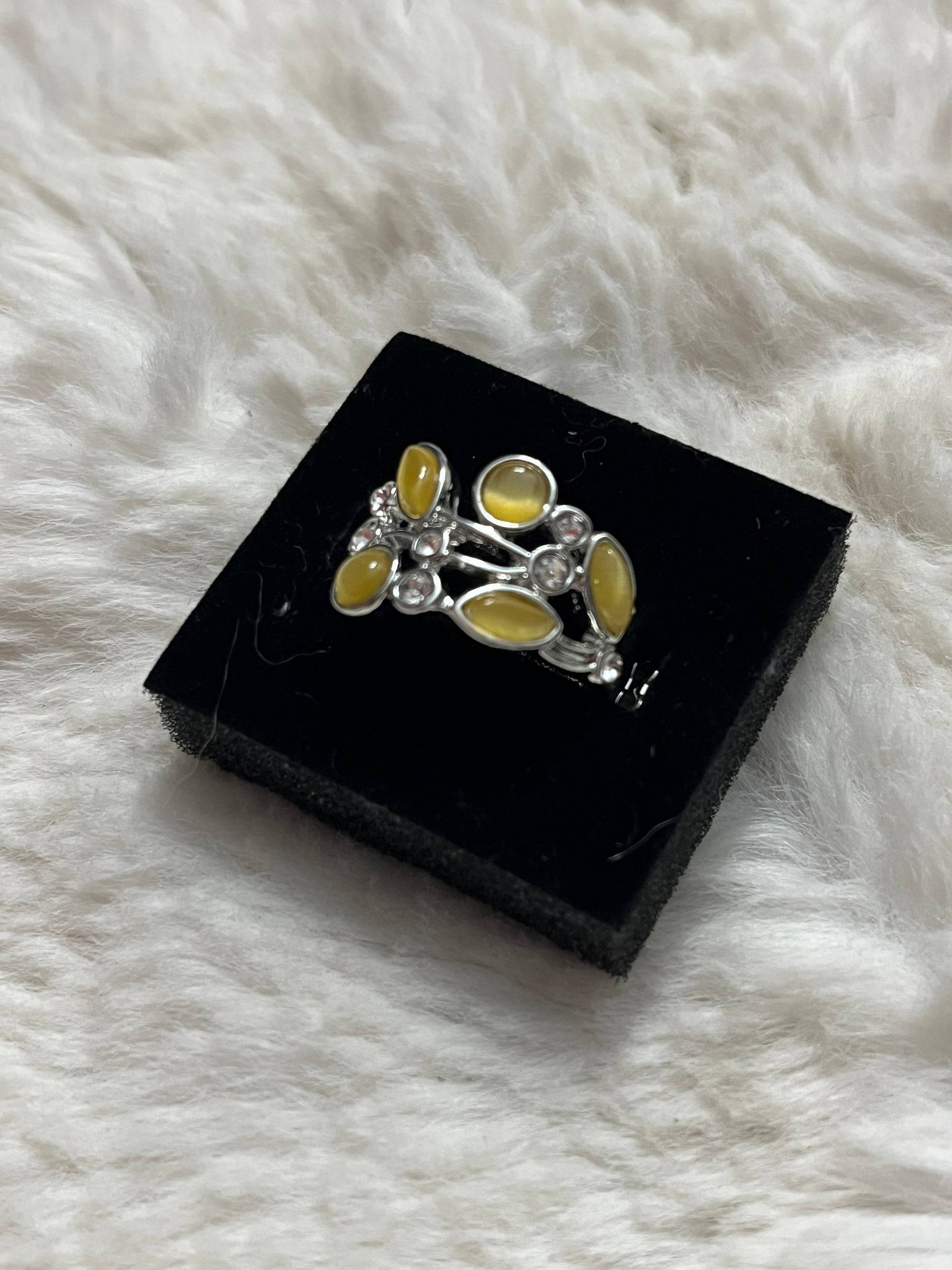 Make a subtle yet striking statement with this Sunny Bloom Ring. Designed with a polished silver finish and radiant yellow stones accented by sparkling crystals, this ring delivers timeless style with a modern edge.