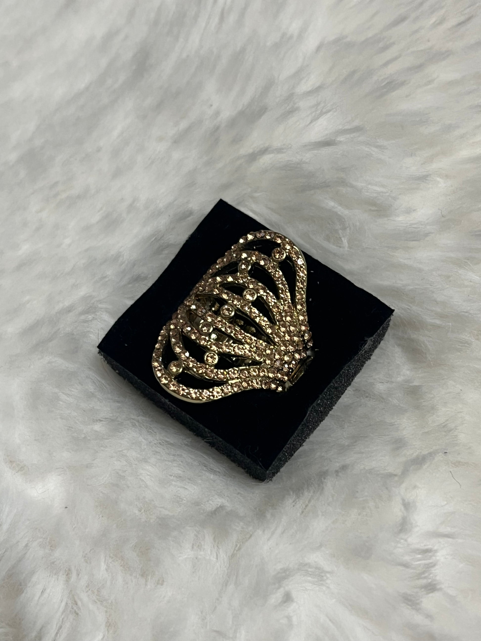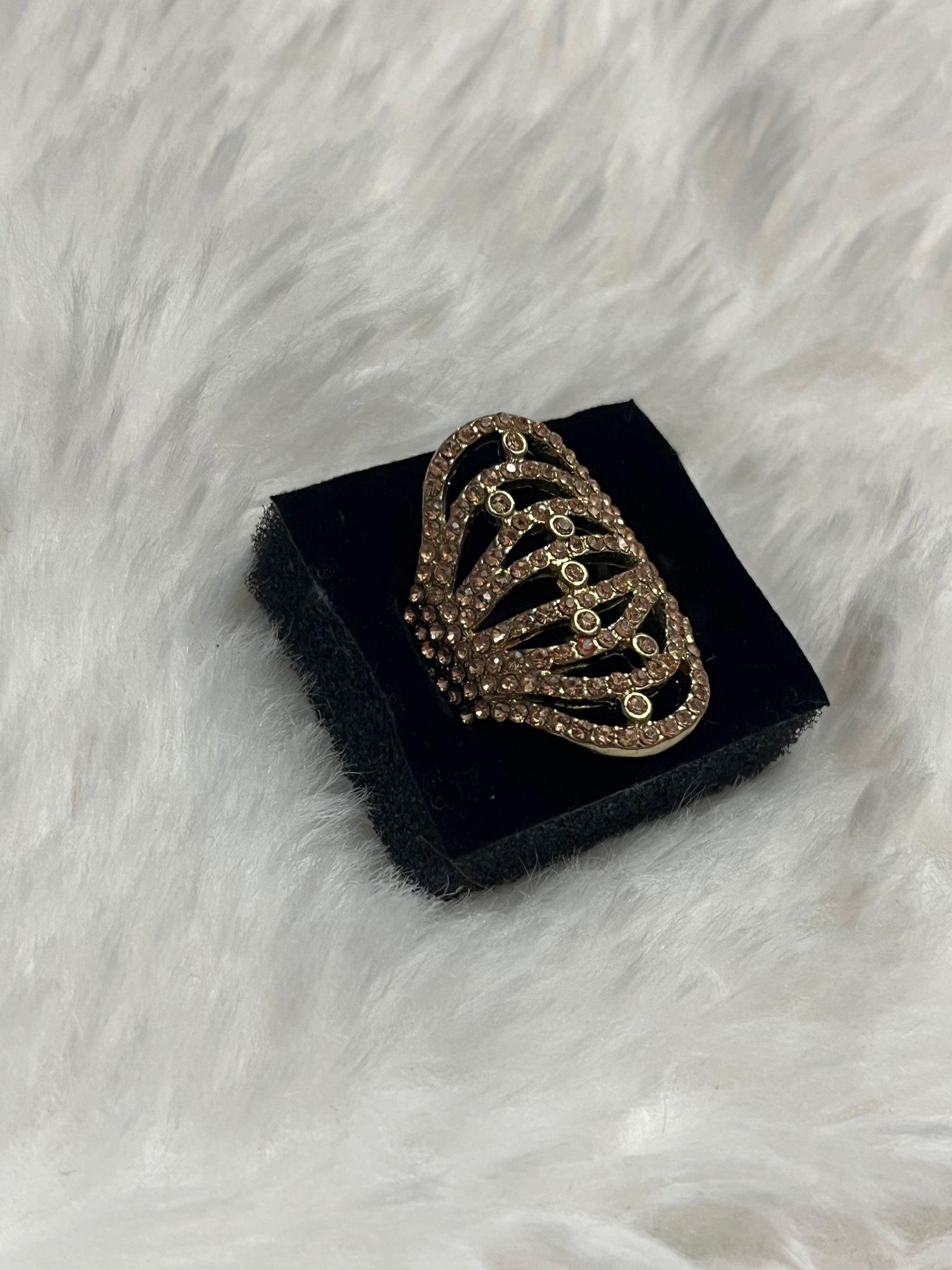 Add bold brilliance to your collection with the champagne swirl statement ring. Designed with a dramatic, open-layer silhouette and covered in radiant champagne rhinestones, this ring gleams with luxe elegance and a modern twist. The wavy, cage-style design creates eye-catching dimension, while the gold-tone setting brings warmth and glow to every movement.