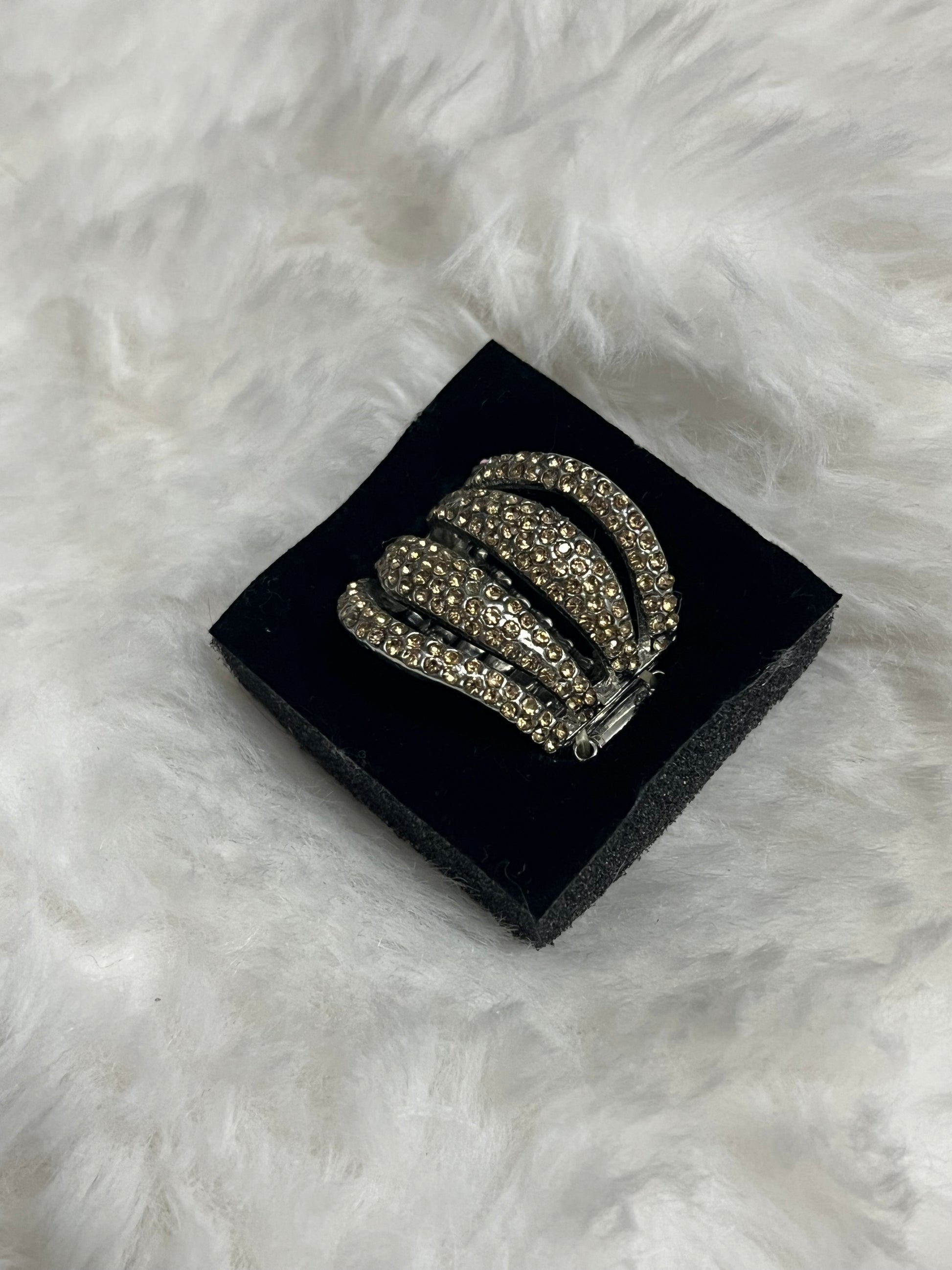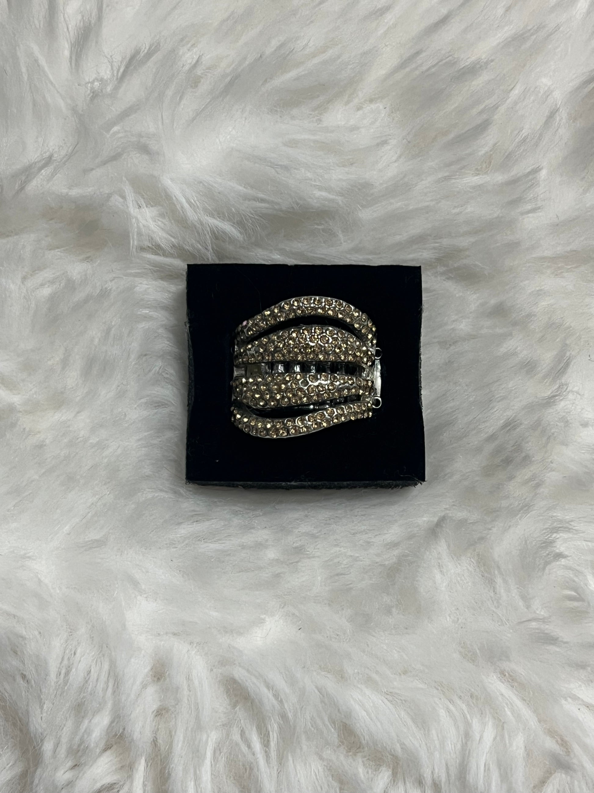 Add bold brilliance to your collection with the champagne wave statement ring. Featuring layered bands of champagne rhinestones with a sleek row of smoky gems at the center, this ring captures the perfect balance of edge and elegance. The silver-tone setting adds modern shine, making it your go-to piece when you’re ready to stand out.