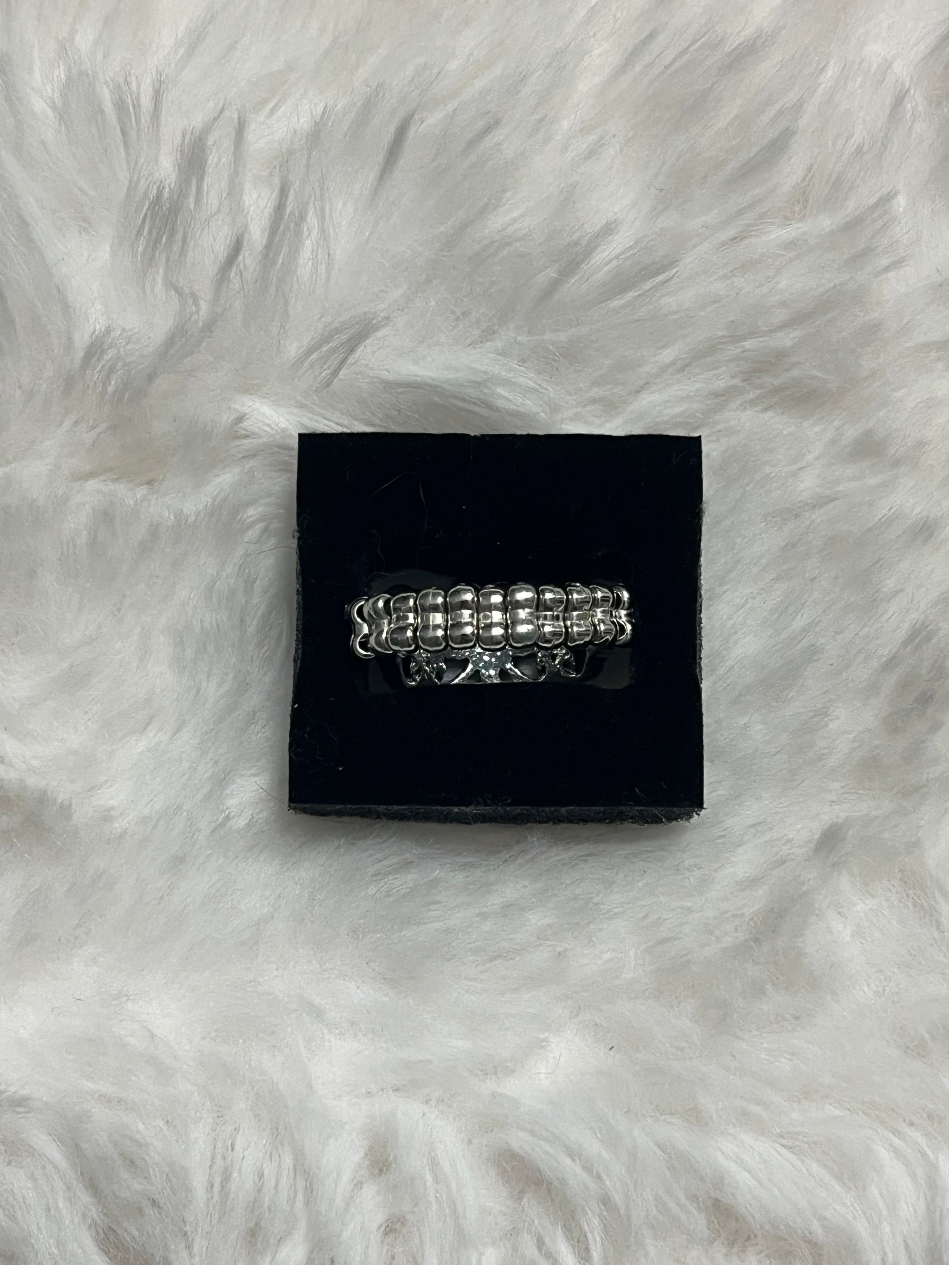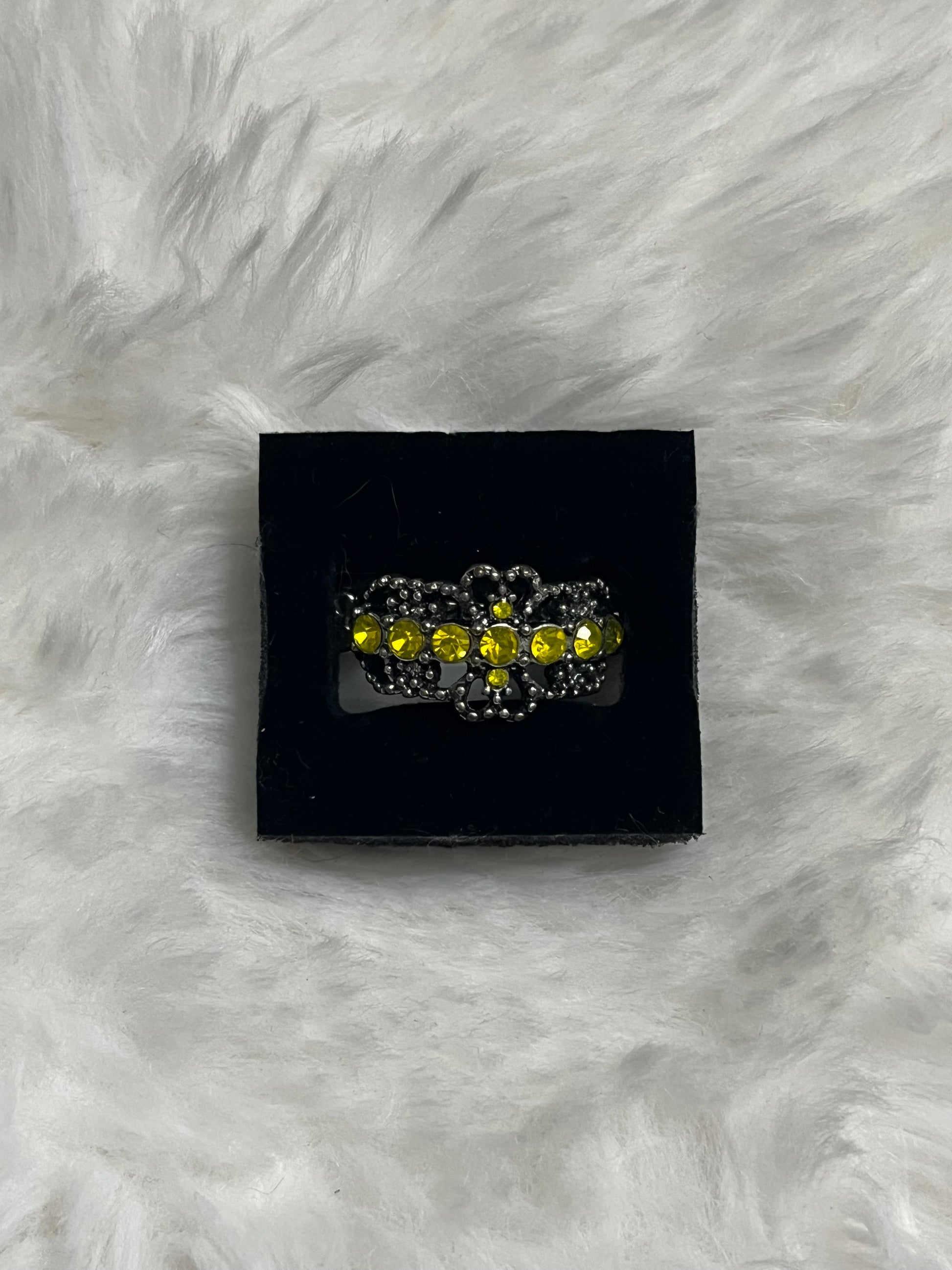 Radiate dark glamour with the midnight bloom ring, a moody masterpiece of elegance and edge. Designed with antique silver detailing and a bold row of lemon-yellow rhinestones, this ring adds just the right pop of color to your boldest looks. A delicate floral centerpiece anchors the design, blending gothic charm with a dash of glow.
