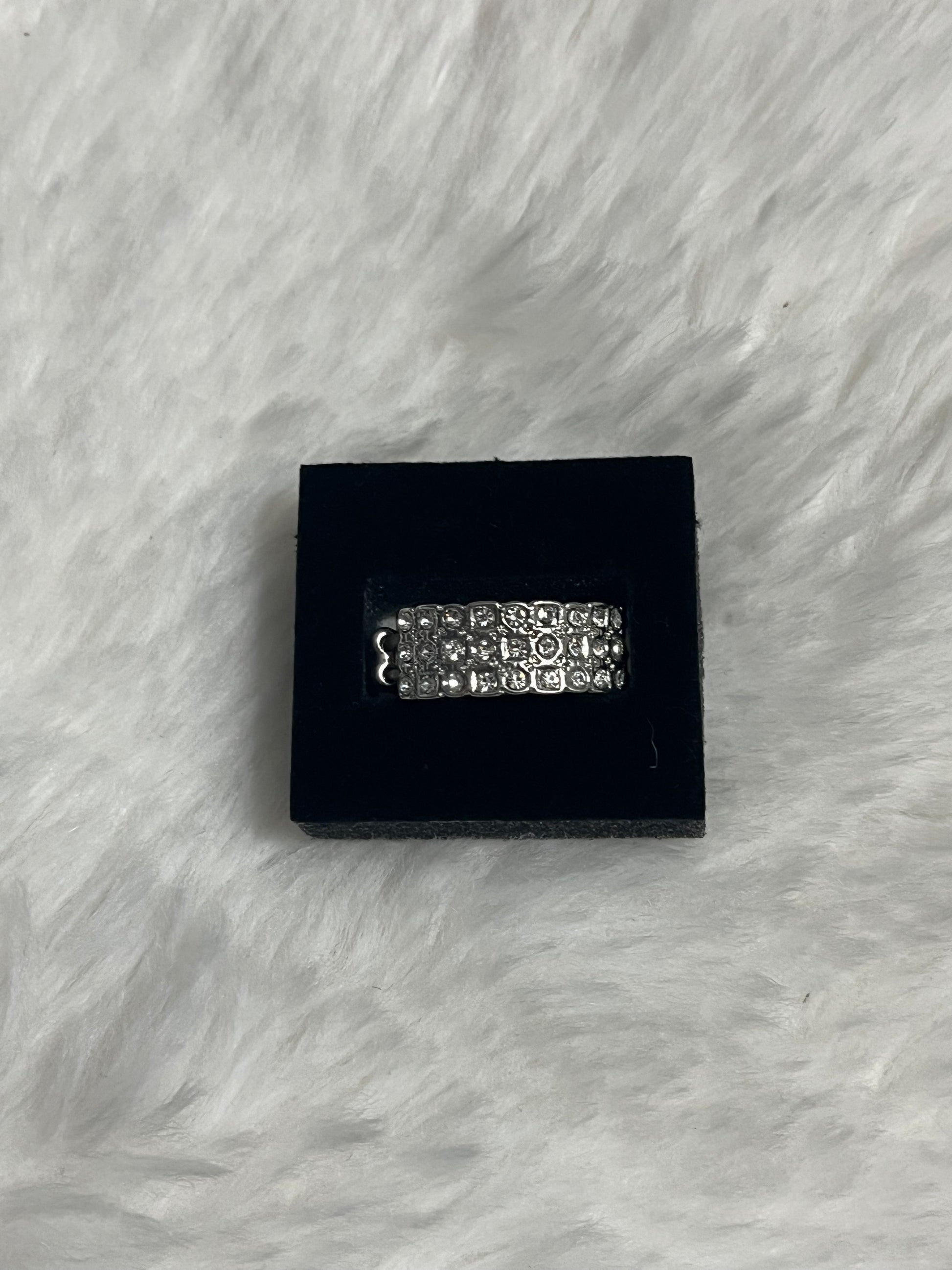 Add striking sparkle to your collection with this dazzling silver rhinestone ring. Designed with a polished silver-tone finish and layered rows of brilliant clear rhinestones, this ring delivers bold shine with a refined edge. The faceted stones catch the light beautifully for an eye-catching, luminous look.