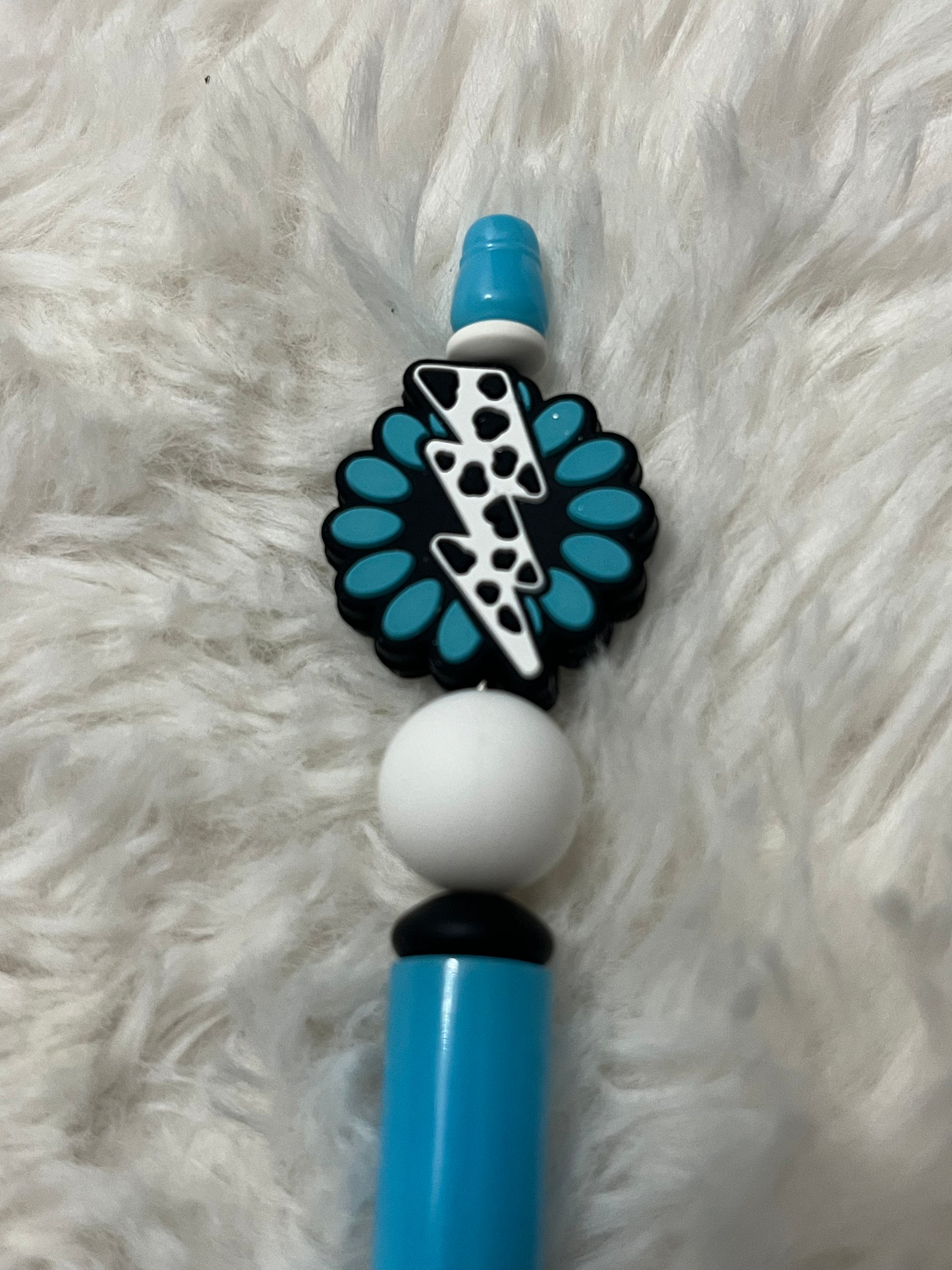 - This pen features a bright turquoise body accented with chunky silicone beads and a standout charm showcasing a cow print lightning bolt against a turquoise flower backdrop. It’s cute, country, and just the right amount of sass! Comes with a smooth black ink refill so you can write (or doodle) in style.