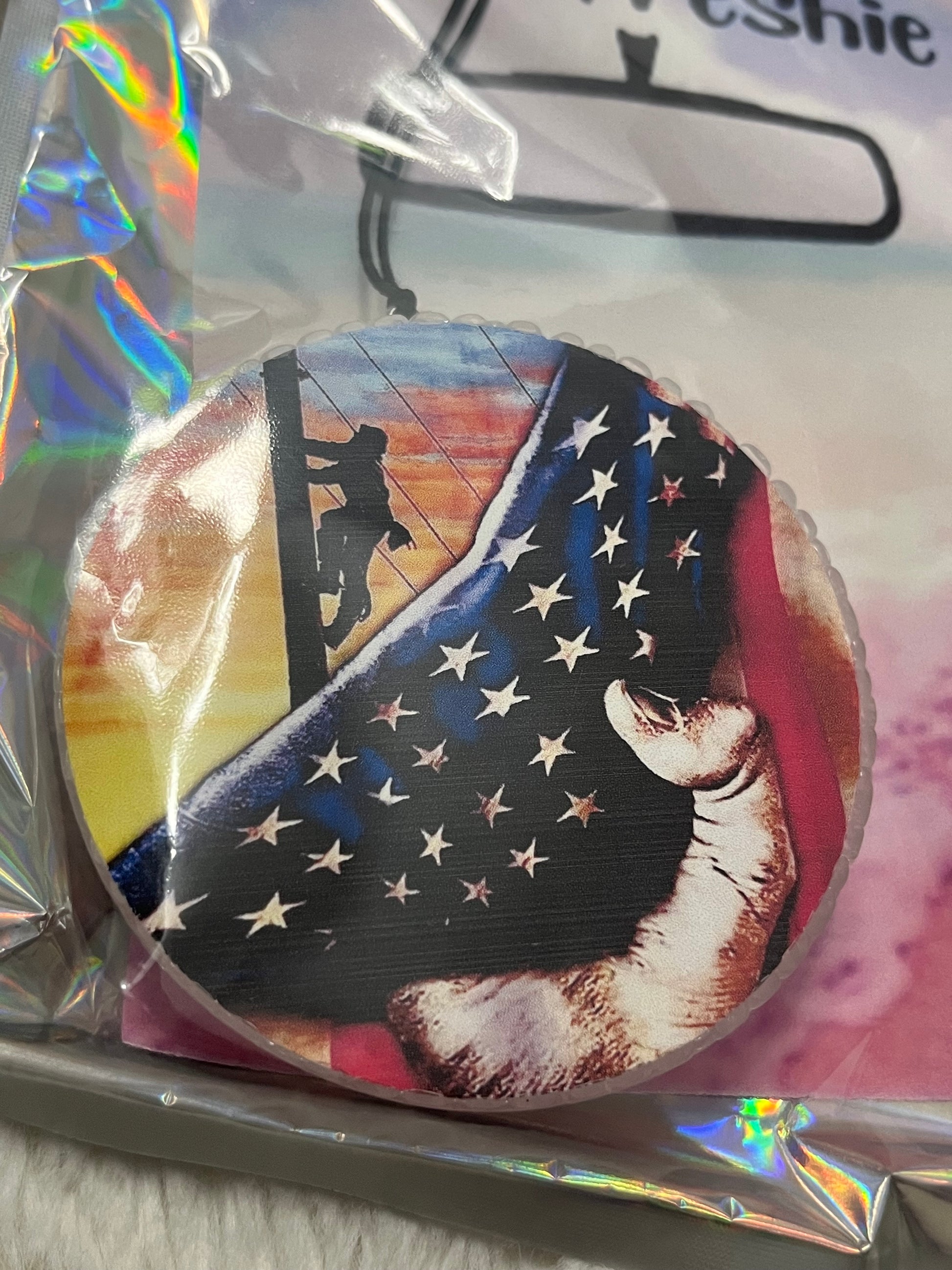 - This round freshie features a detailed image of a lineman working on the pole at sunset, with an American flag overlay. The warm tones of the sky and the bold stars and stripes create a powerful tribute to the men and women who risk it all to keep the current flowing.