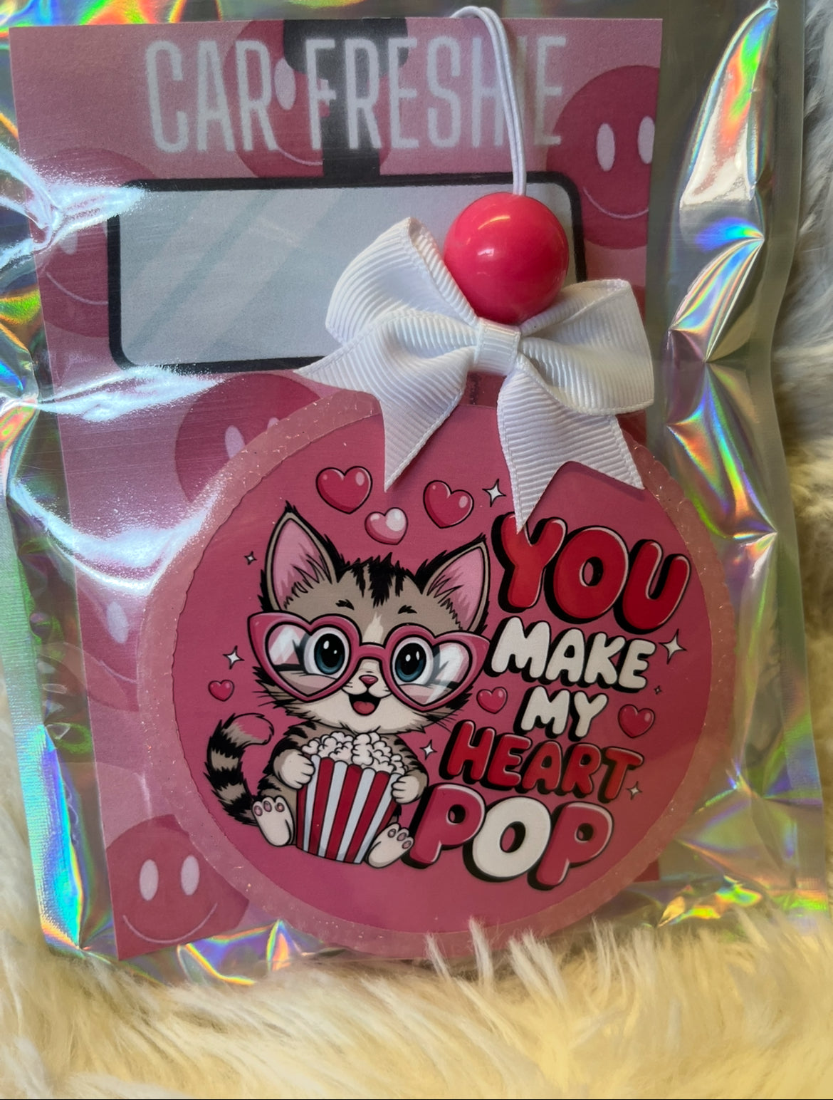 Brighten your ride (and your mood) with this adorable “You Make My Heart Pop” Cat Freshie! Featuring a sweet kitty with heart-shaped glasses and popcorn in hand, this Valentine-inspired design adds a pop of cuteness and irresistible scent to any space. Finished with a pink bead and white bow, it’s the perfect mix of fun, flirty, and fresh.