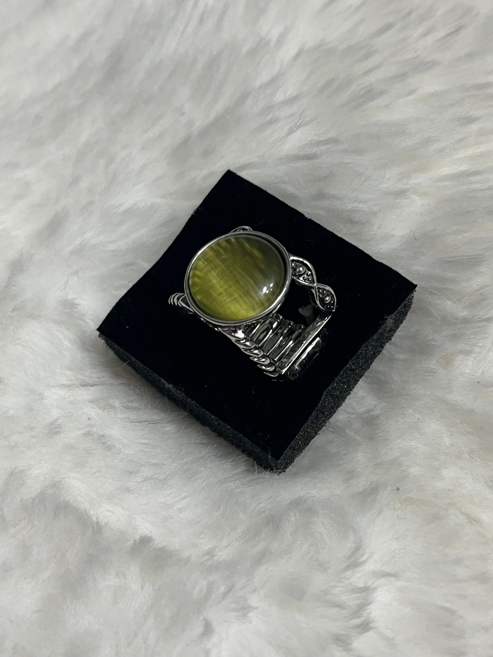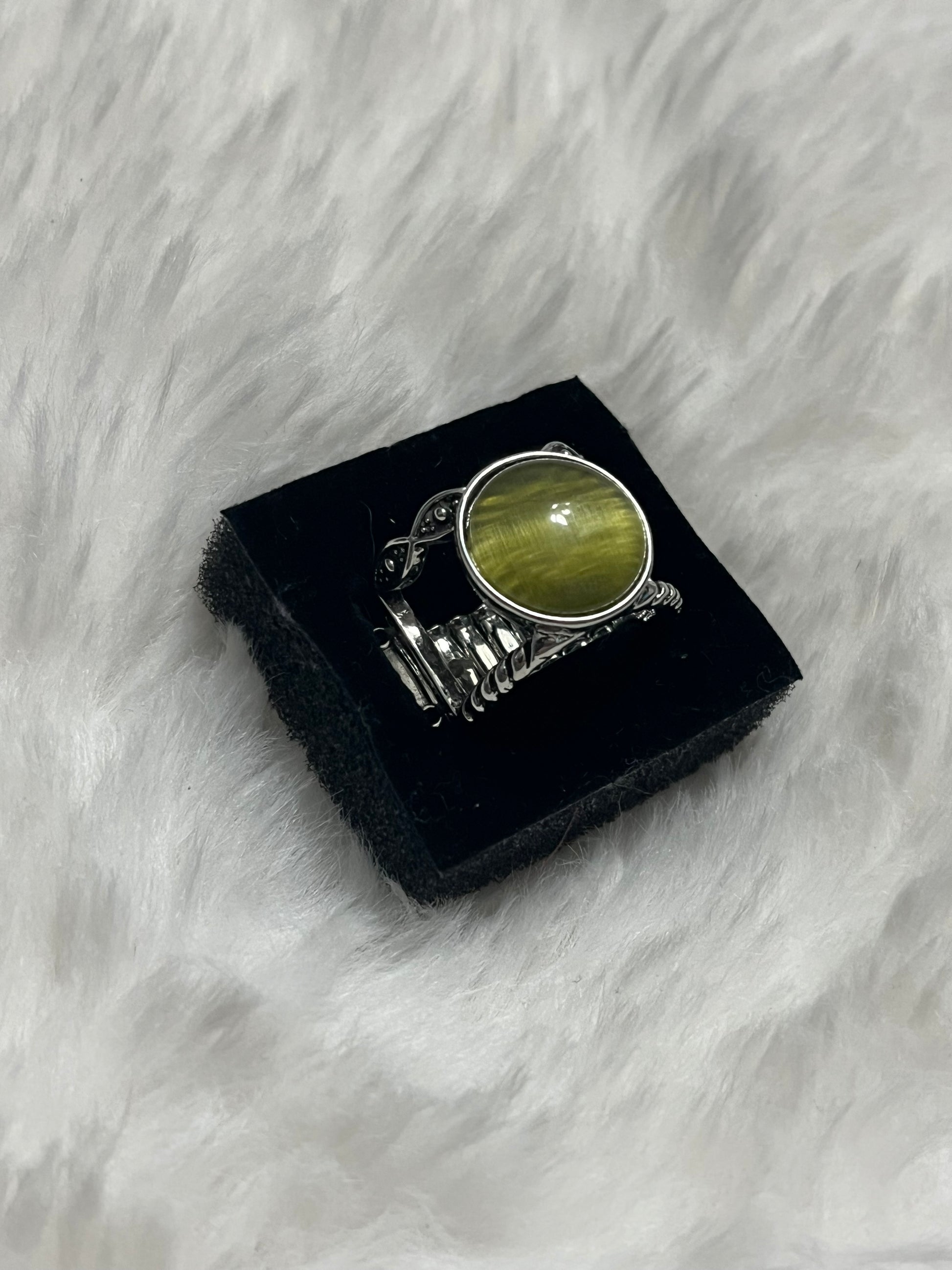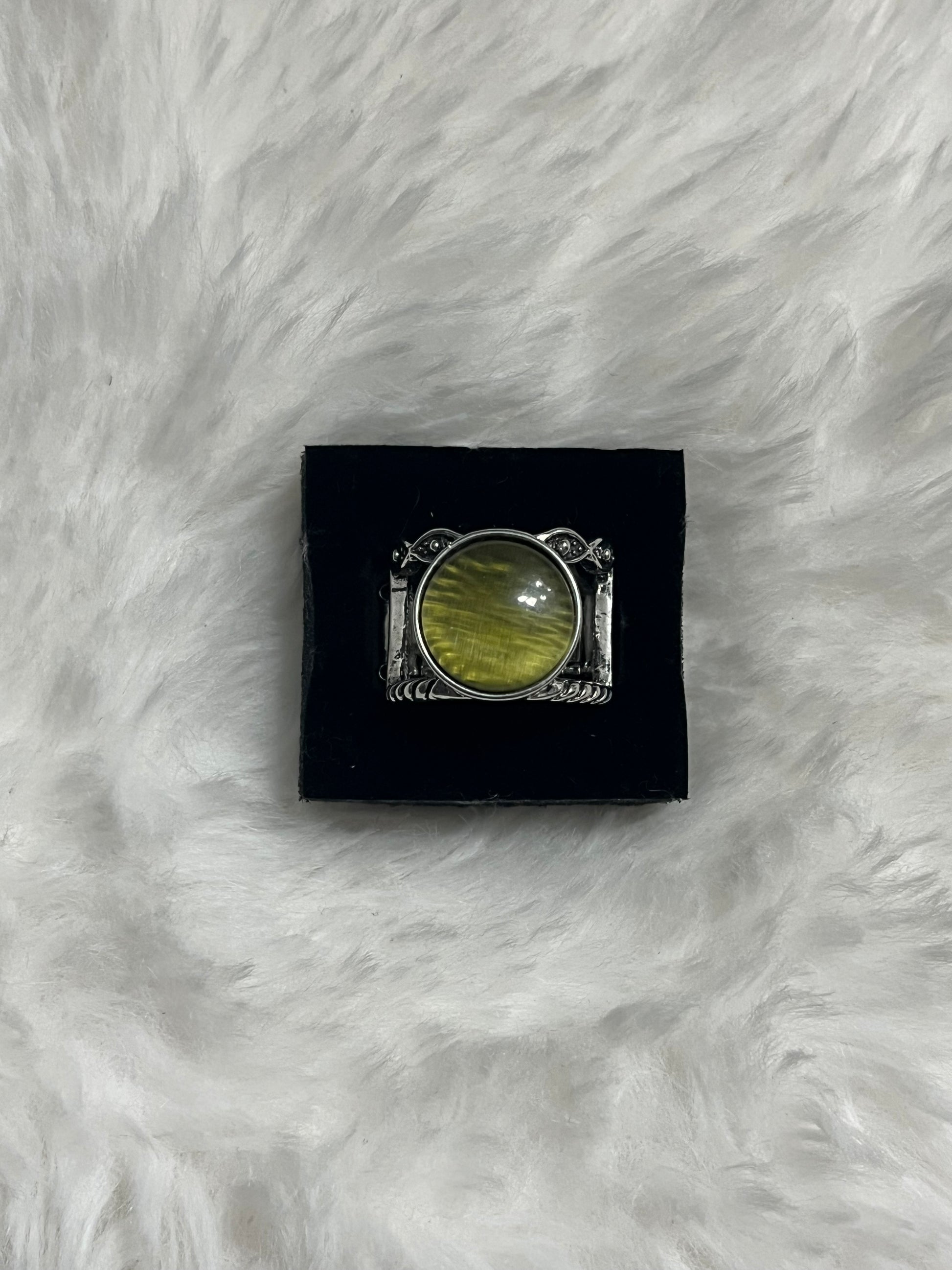 Add bold brilliance to your collection with the solar glow statement ring. Designed with a luminous yellow cat’s eye stone and framed by sleek silver-tone filigree, this ring radiates celestial energy and vintage charm. The bold round shape gives it an otherworldly allure, while the metallic detailing adds just the right amount of edge.