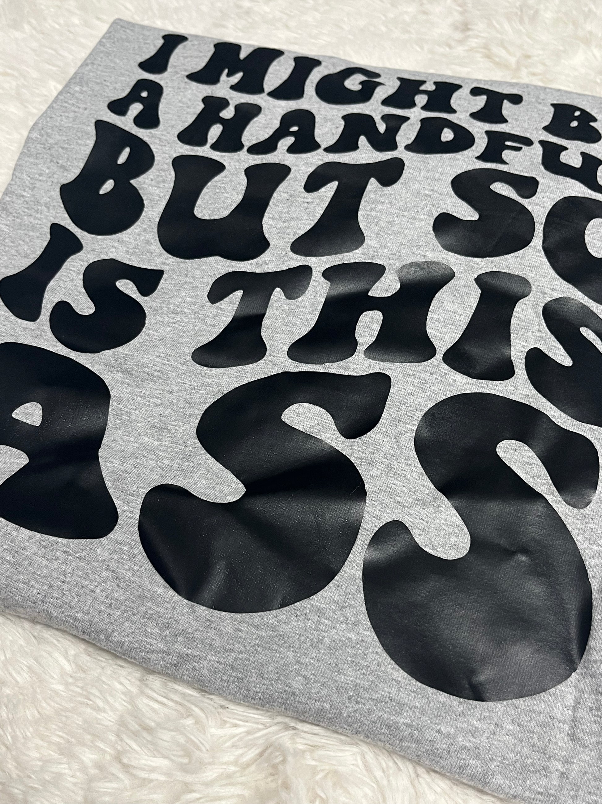 - Large statement text reading “I Might Be a Handful But So Is This Ass,” printed in bold black lettering that delivers maximum impact.