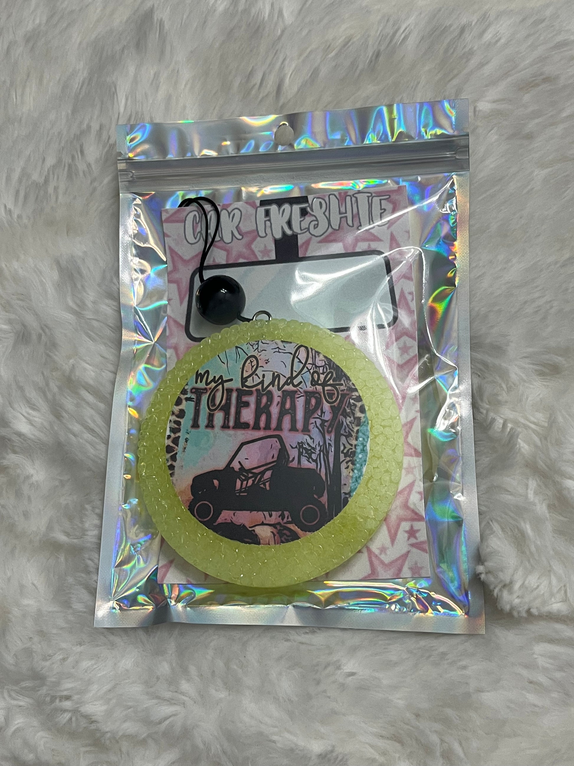 Have your car smelling real good with this "my kind of therapy” side x side car freshie hanging from your rearview mirror! Scented in Pineapple Mango: a blend of pineapple and mango to create a tropical and sweet scent! May melt in extreme heat!