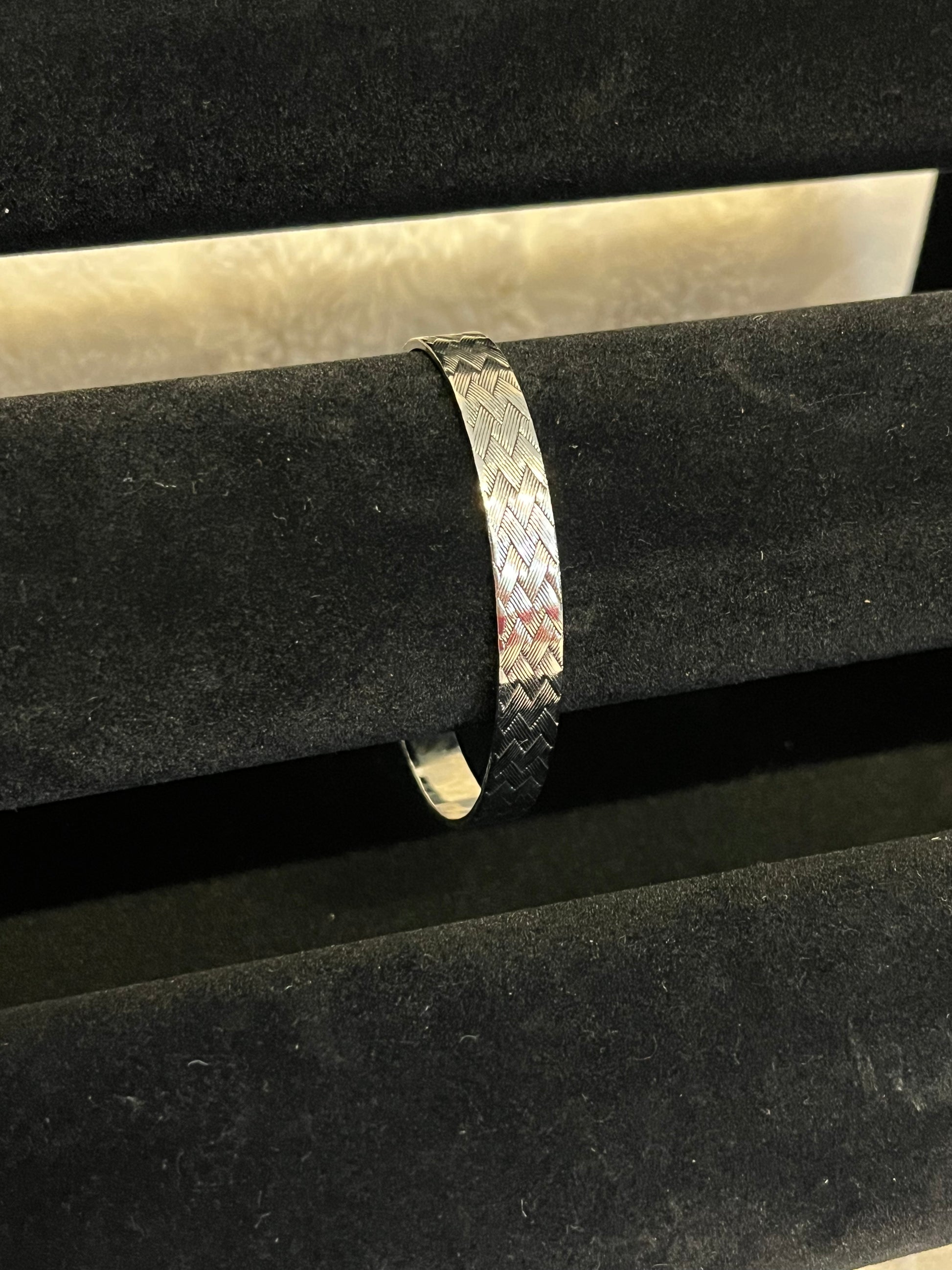 A sleek, easygoing cuff that brings effortless shine to any jewelry lineup. The etched chevron-weave texture gives it just enough detail to stand out while still keeping things clean, simple, and wearable with absolutely everything.