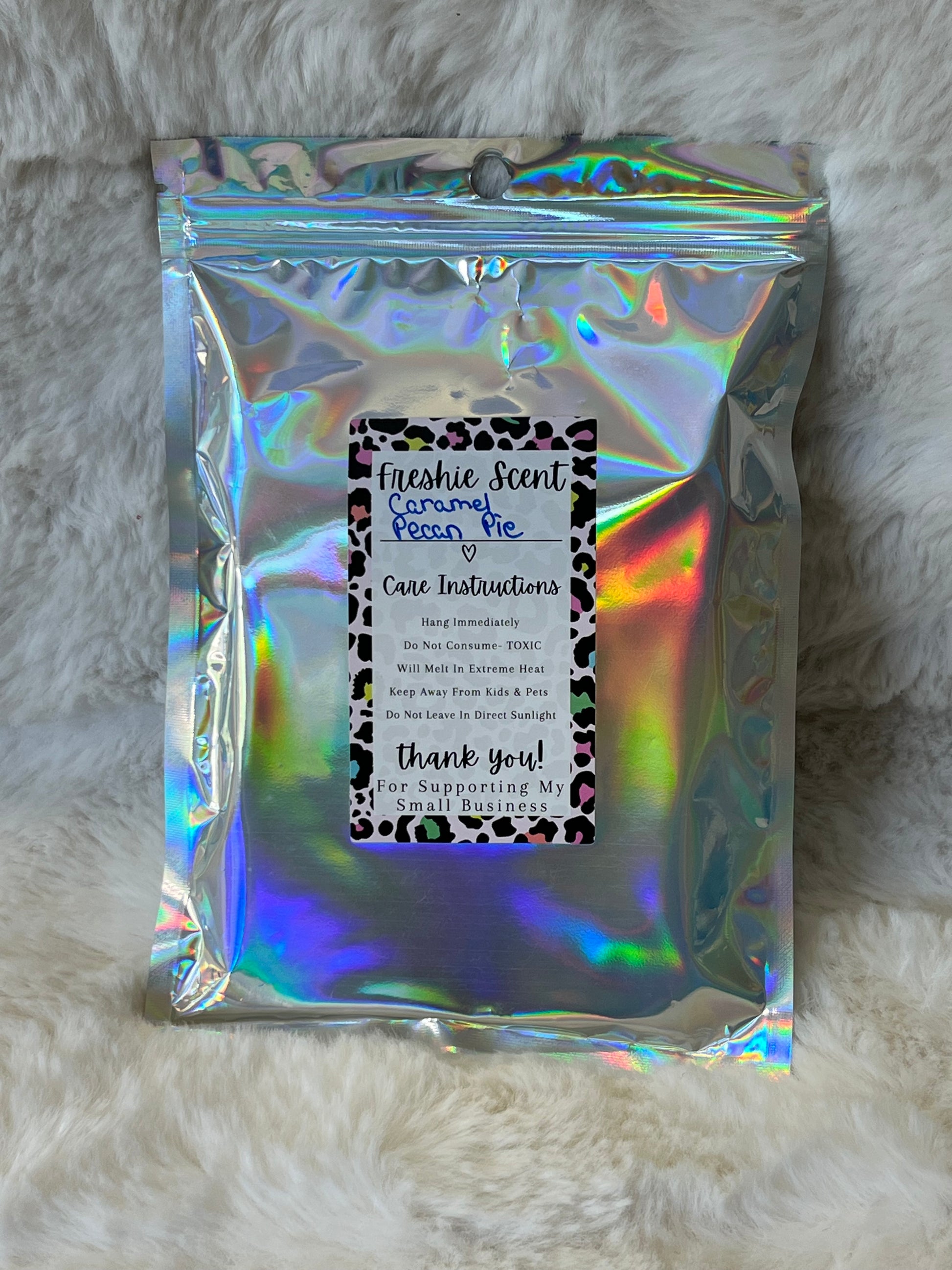 Green - Scented in Caramel Pecan Pie: a blend of coconut, cocoa, vanilla, and butter rum to create the smell of a freshly baked caramel pecan pie! This freshie has a bead to top it!
