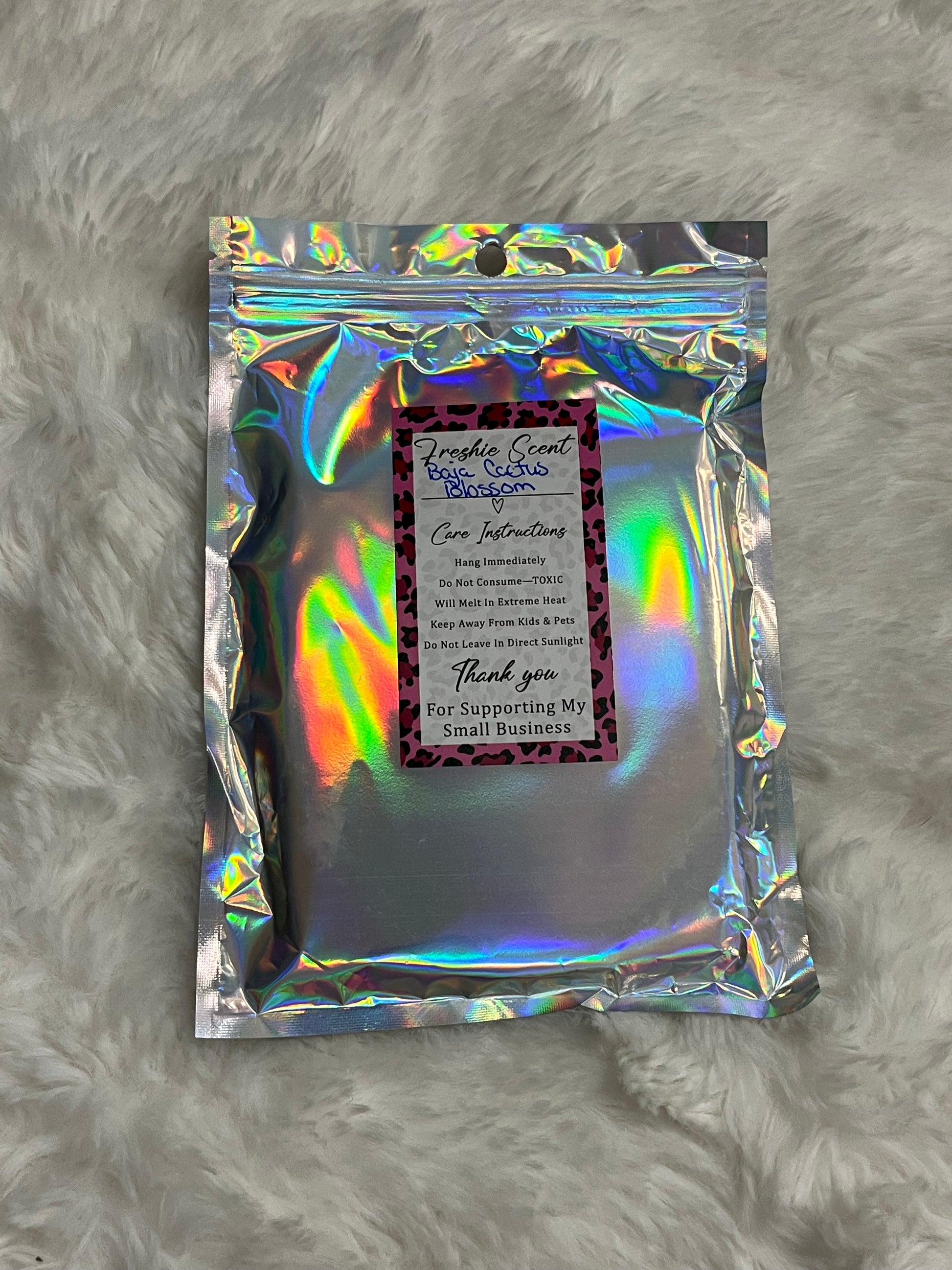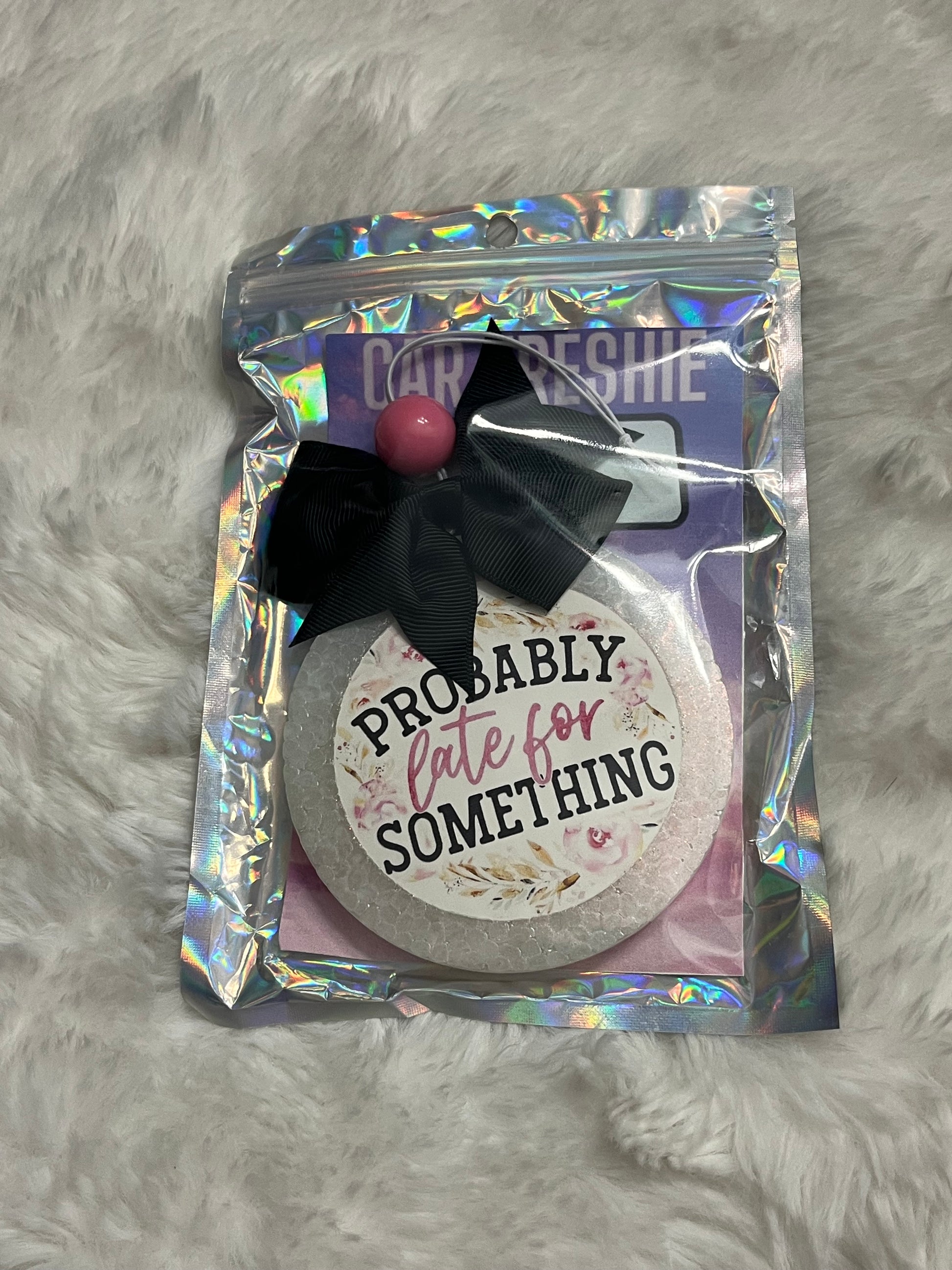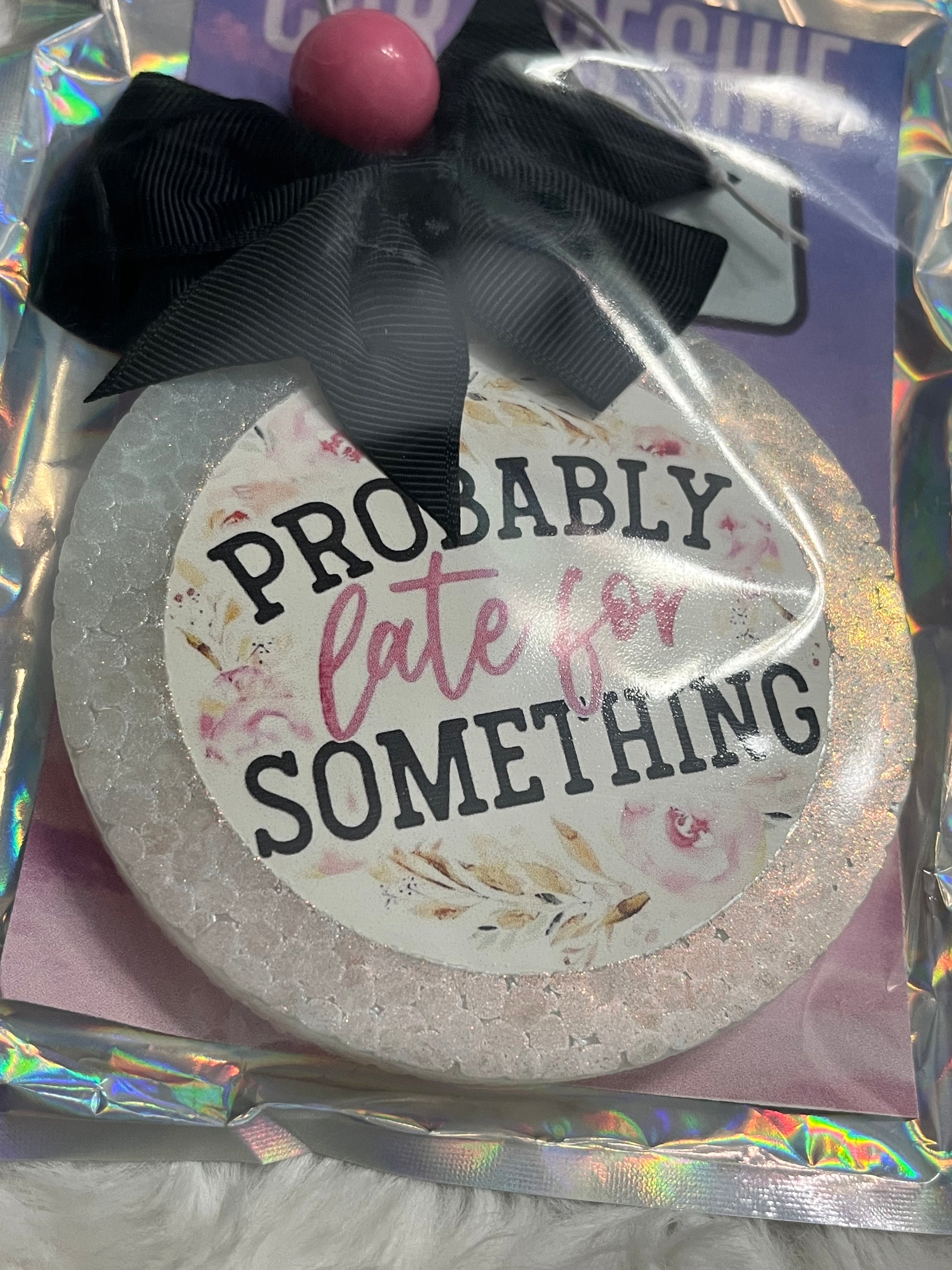 Have your car smelling real good with this "probably late for something” car freshie hanging from your rearview mirror! Scented in Baja Cactus Blossom: a blend of lime, coconut, jasmine, lavender, and sandalwood to create a crisp floral scent! This freshie is topped with a bow! May melt in extreme heat!