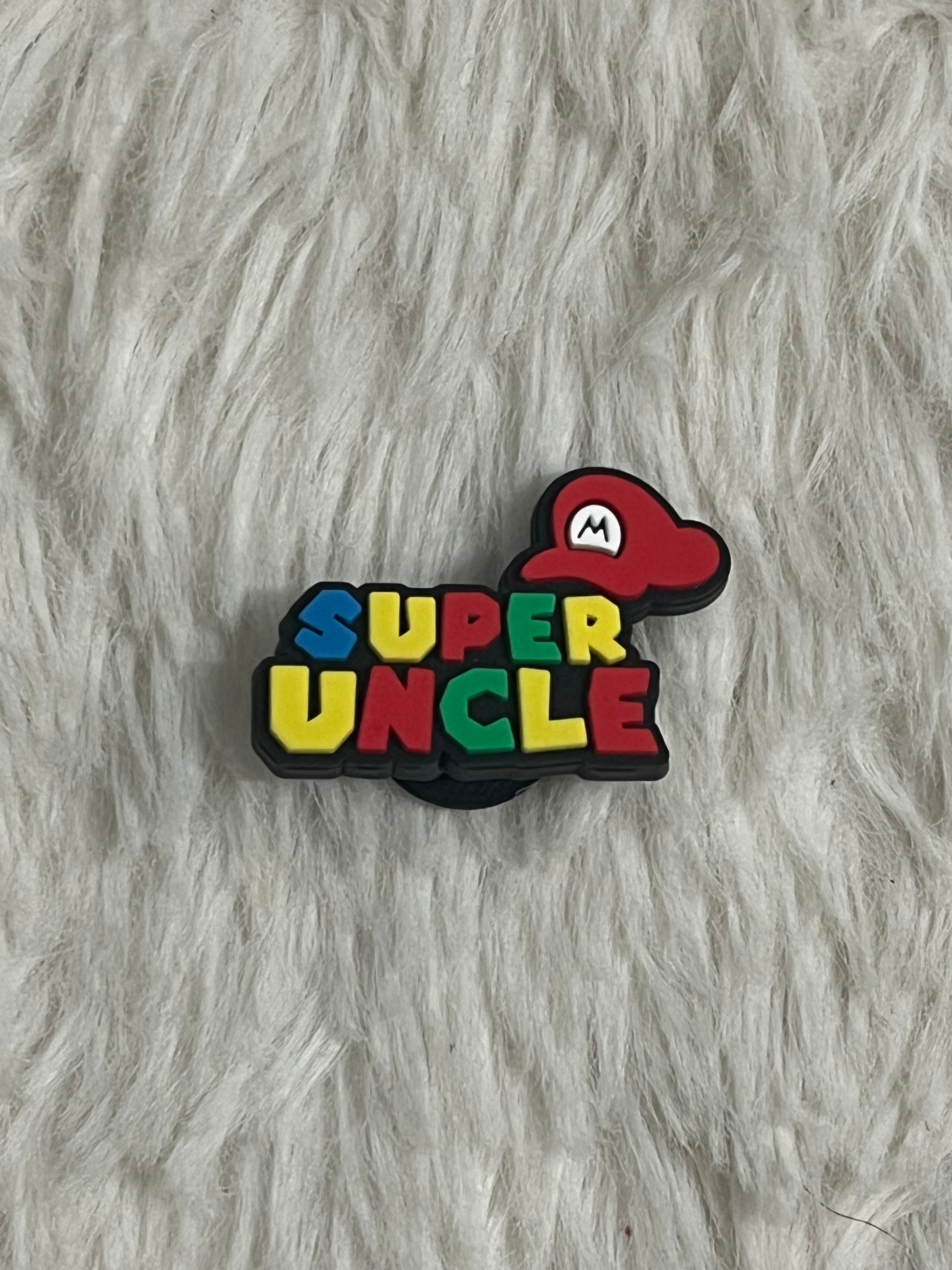 A bold and playful shoe charm made for the uncle who proudly holds the title of “Super Uncle,” featuring colorful block lettering and a classic game-inspired red cap that instantly stands out.
