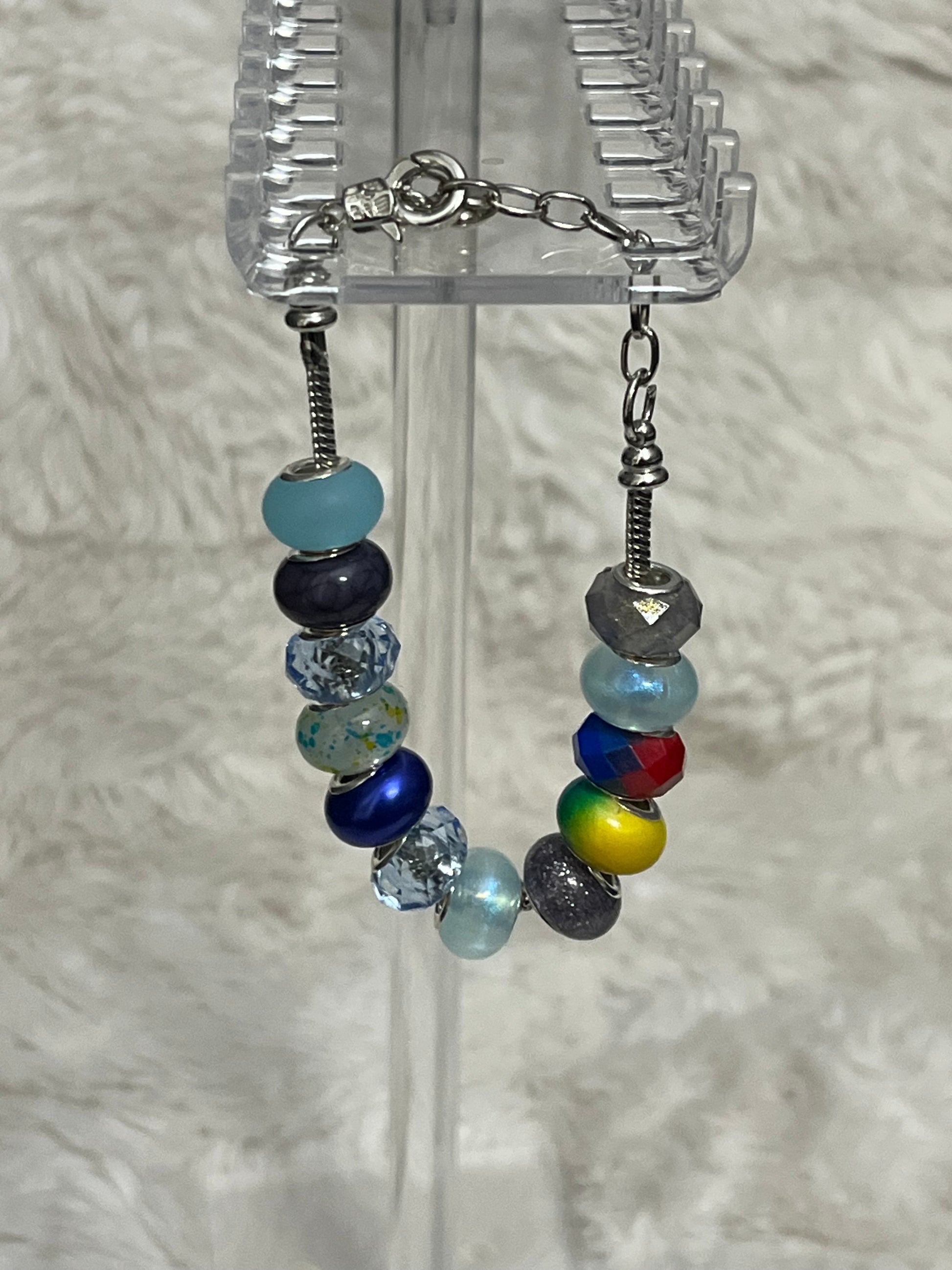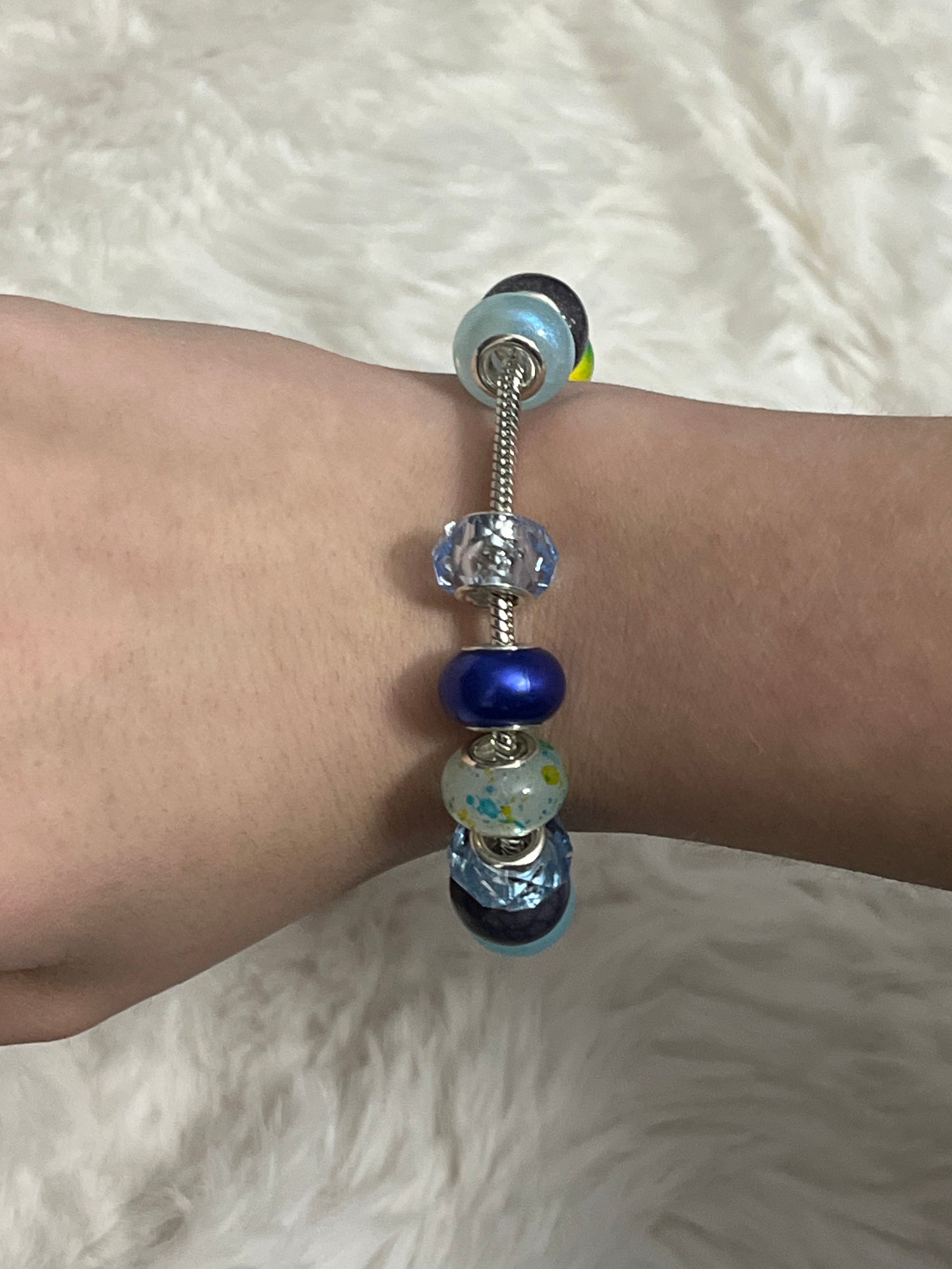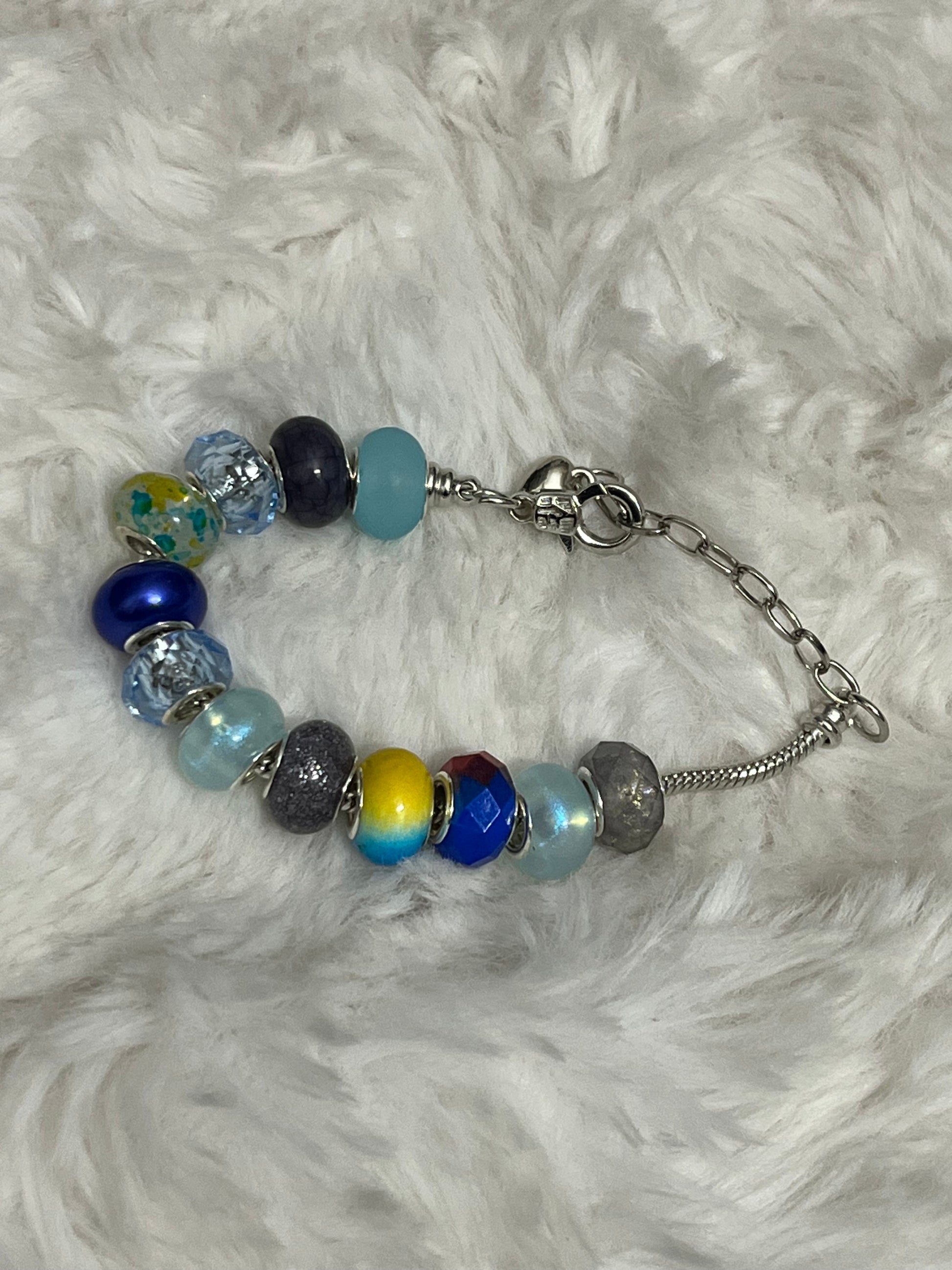 Dive into bold color with this cool-toned charm bracelet, a vibrant mix of ocean blues, deep navy, sunny yellow, and glittering grays. From pearlized shimmer to marbled glass and faceted sparkle, each bead is like a little treasure from under the sea—or straight from your favorite vacation daydream.