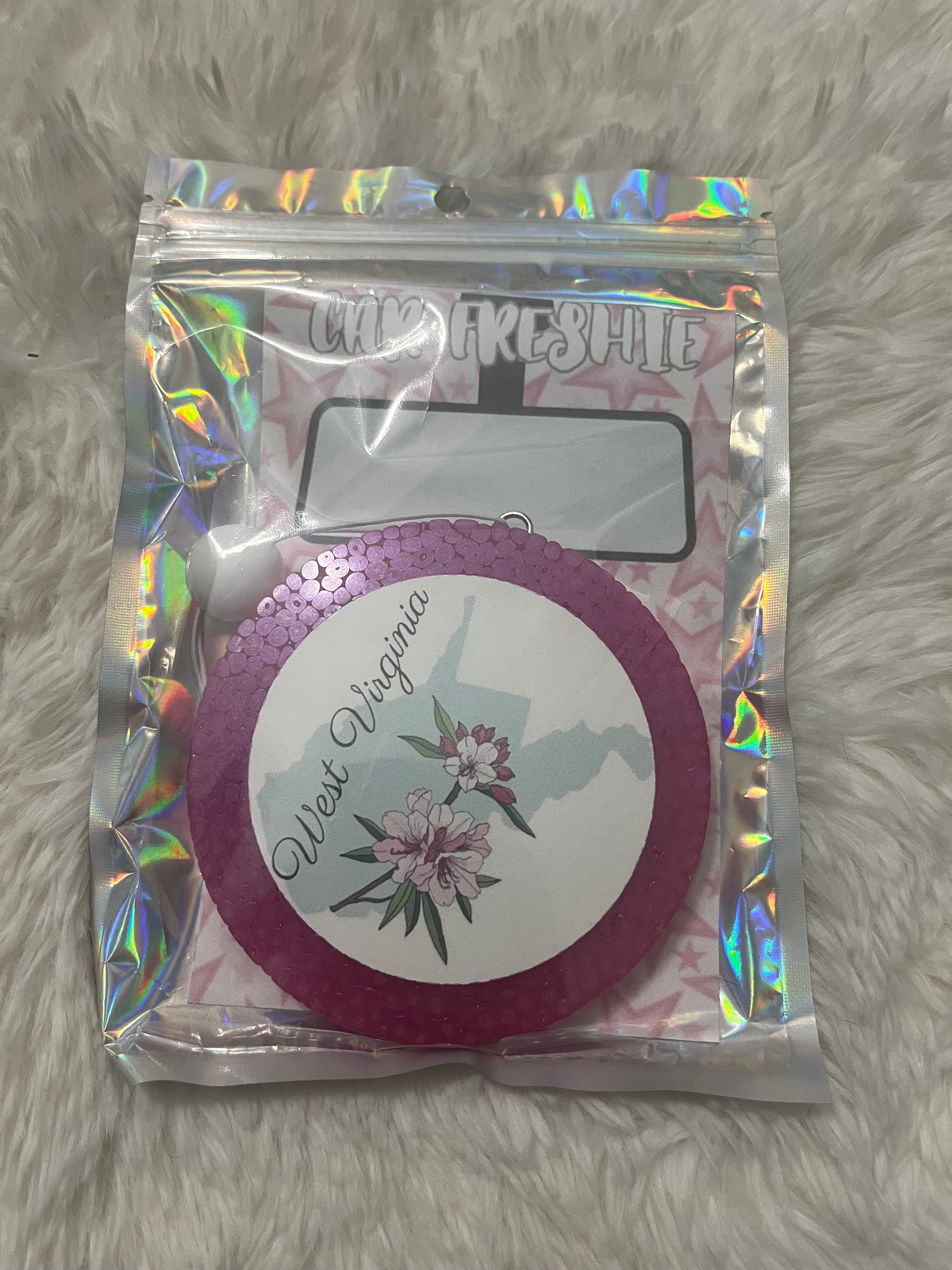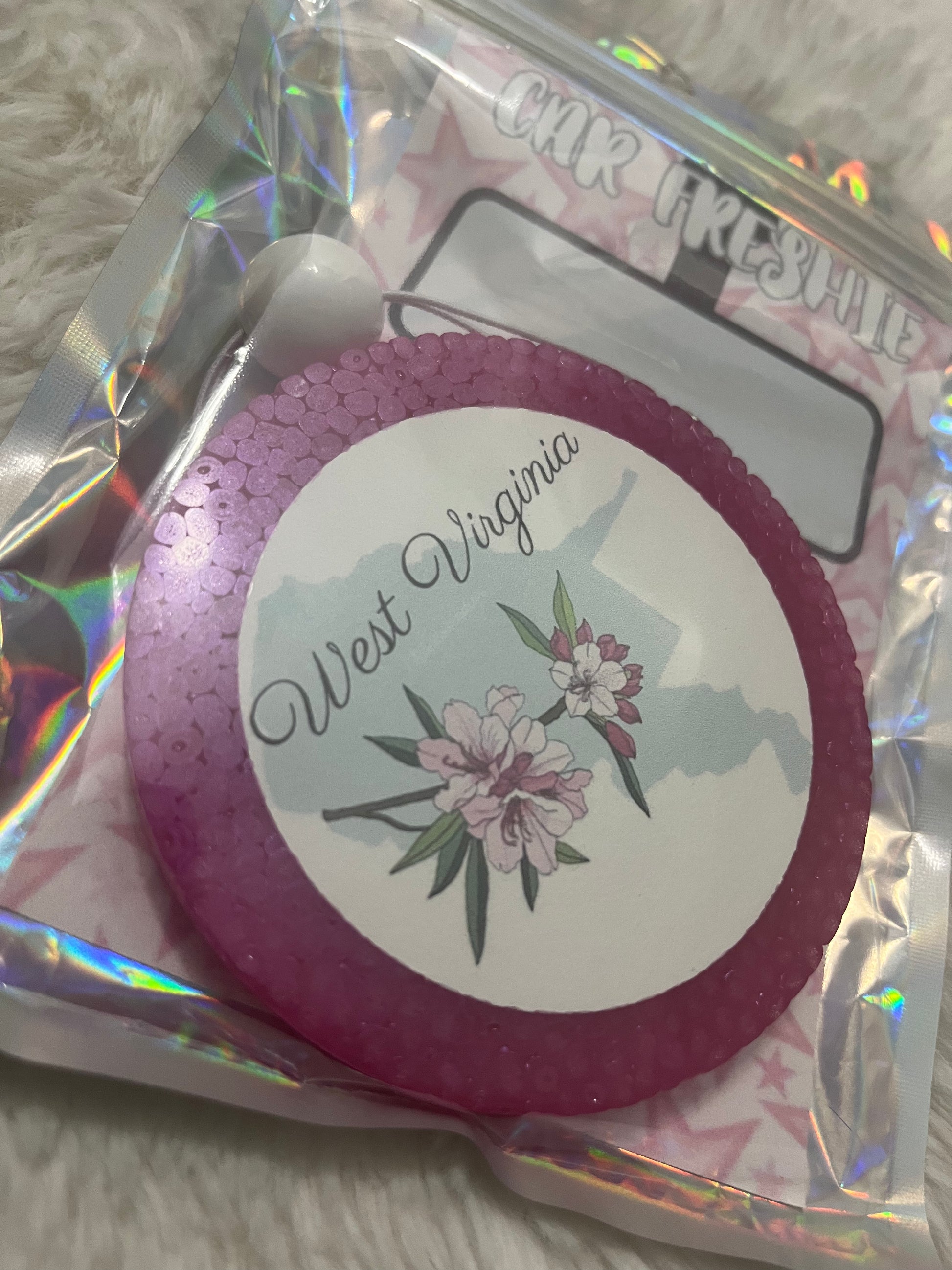 Celebrate your love for the Mountain State with the West Virginia Blooms Freshie Set — a duo of beautifully designed state-shaped freshies that bring hometown pride and sweet fragrance wherever you go.